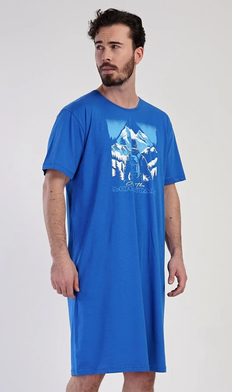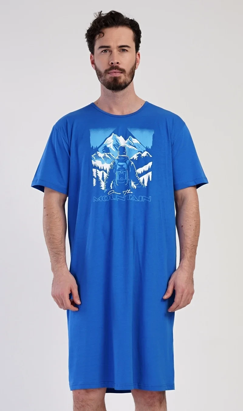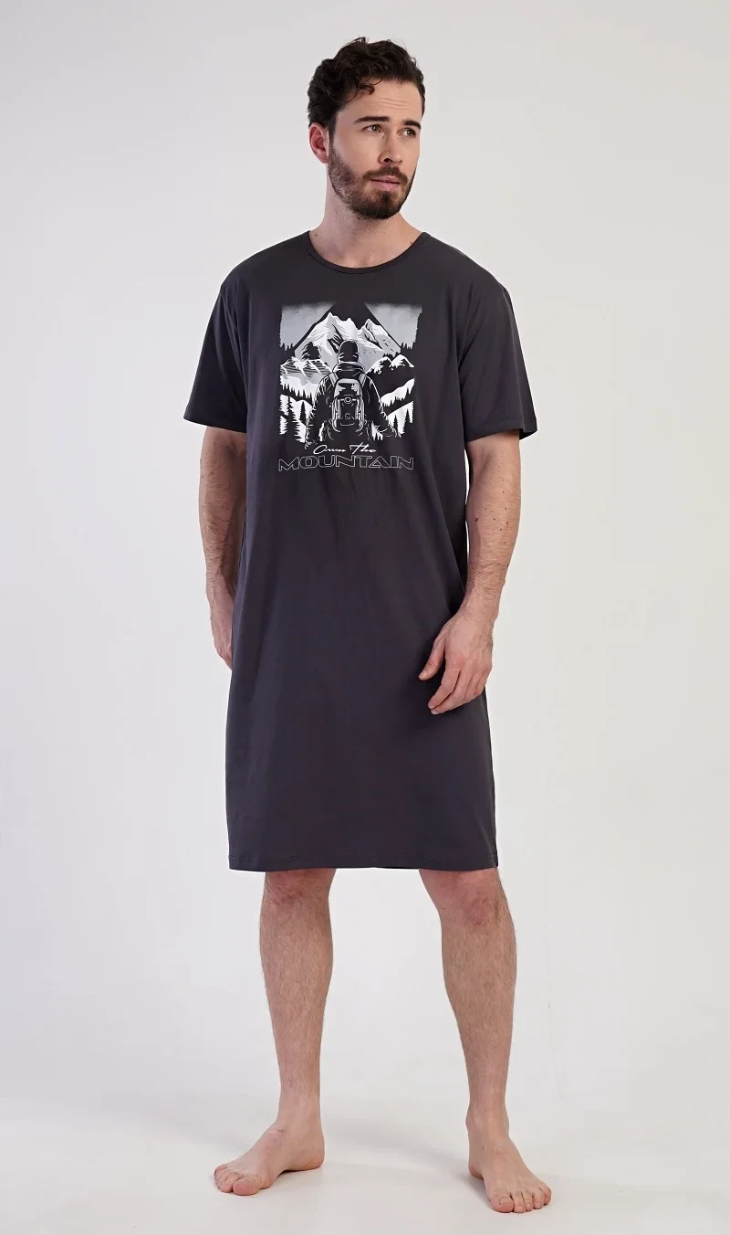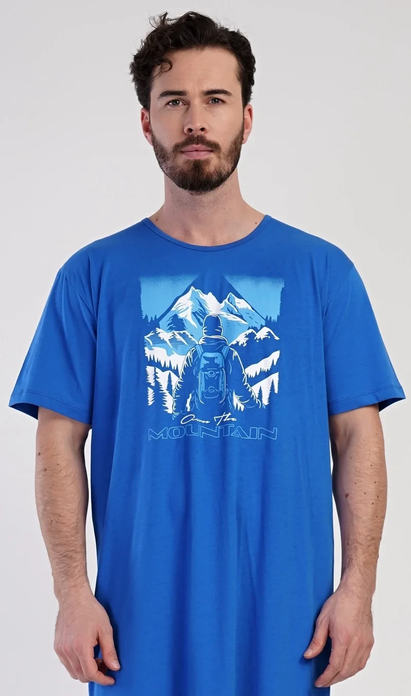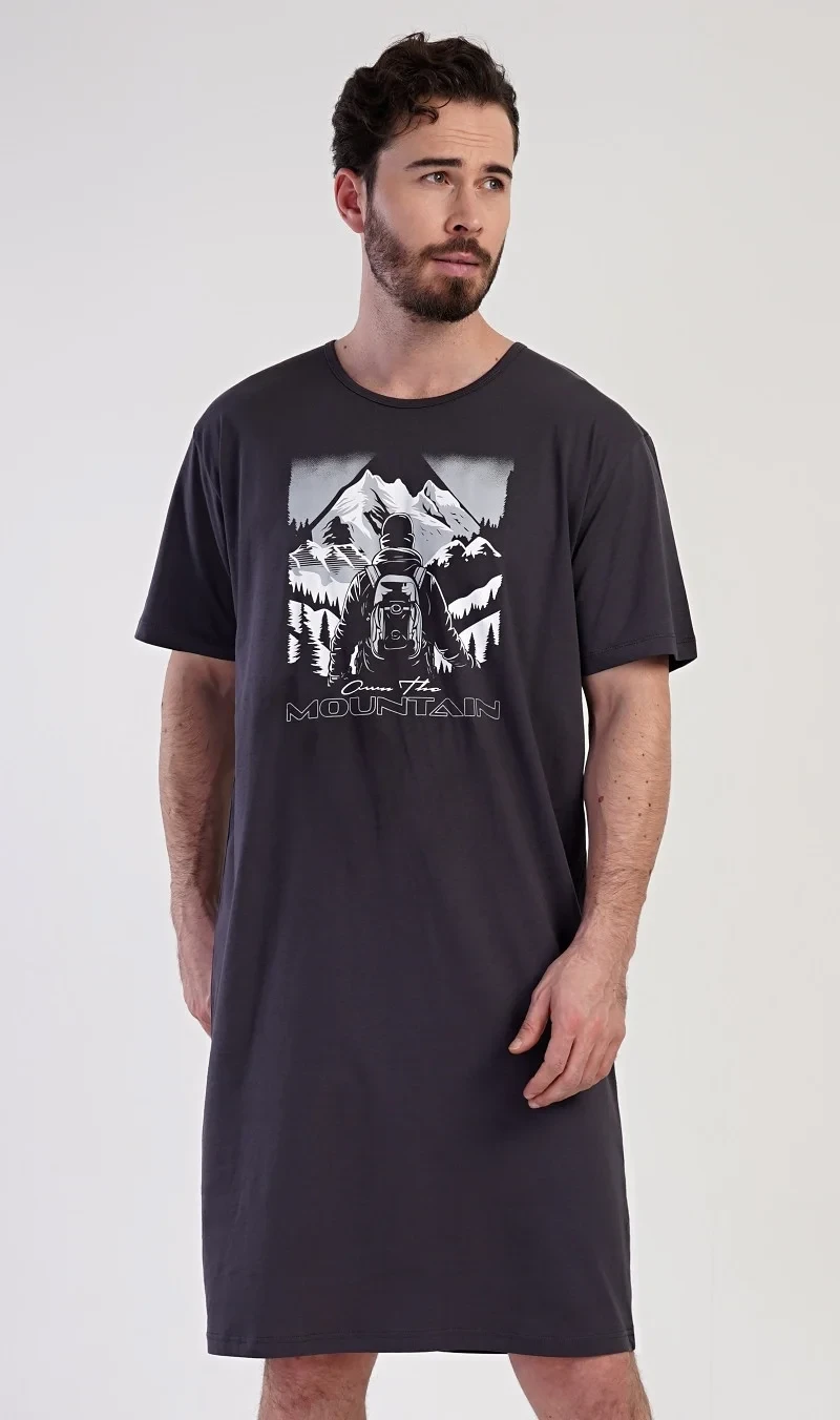 Pánská bavlněná noční košile s krátkým rukávem Mountain. Jednobarevná pánská noční košile s kulatým výstřihem je zdobena obrázkem muže, který jde zdolávat hory a nápisem 'Mountain'. Tato košile je vhodným dárkem pro všechny milovníky hor a turistiky. Použitý materiál je příjemný a poddajný na dotek. Obsah bavlny je 100%.