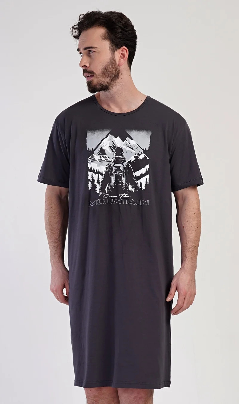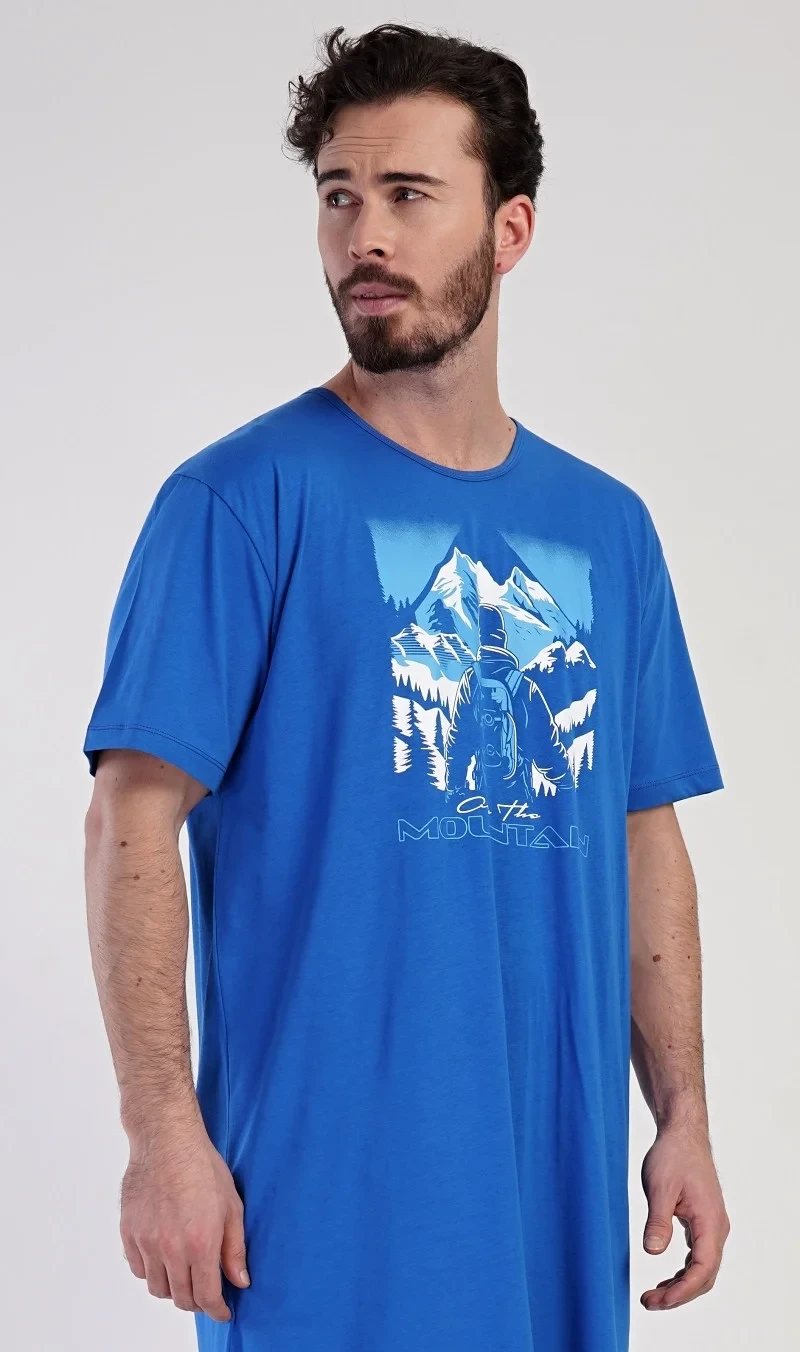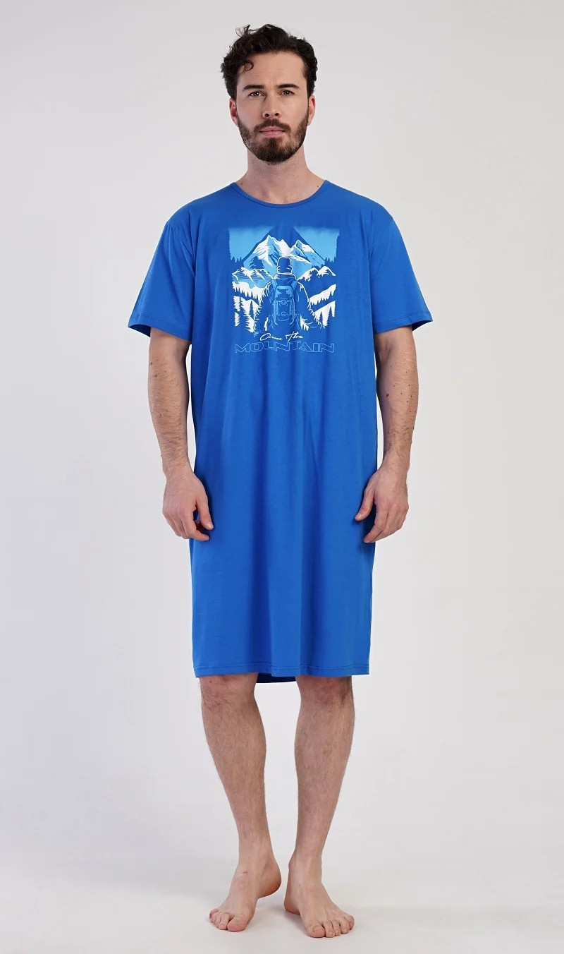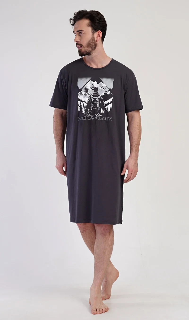 Pánská bavlněná noční košile s krátkým rukávem Mountain. Jednobarevná pánská noční košile s kulatým výstřihem je zdobena obrázkem muže, který jde zdolávat hory a nápisem 'Mountain'. Tato košile je vhodným dárkem pro všechny milovníky hor a turistiky. Použitý materiál je příjemný a poddajný na dotek. Obsah bavlny je 100%.