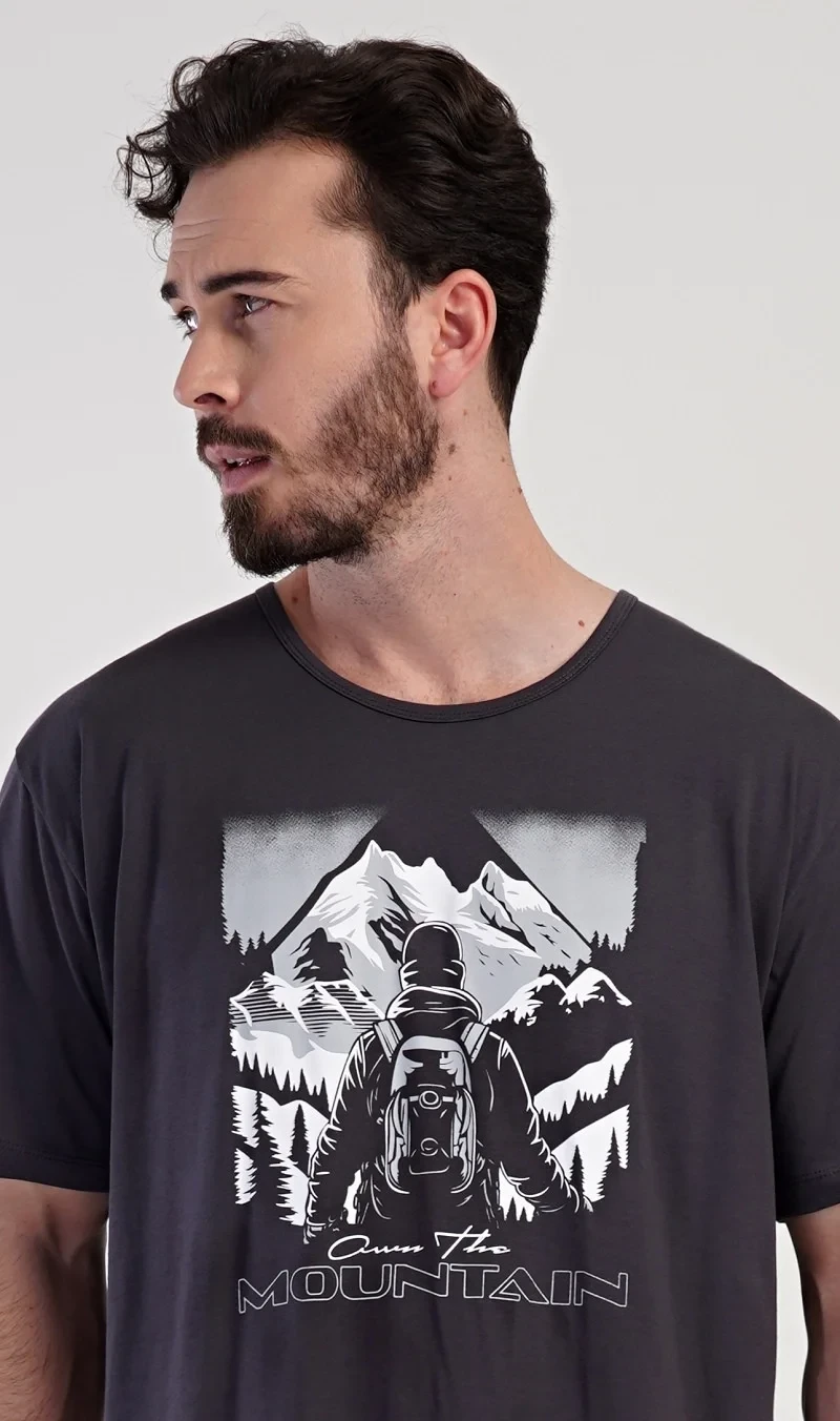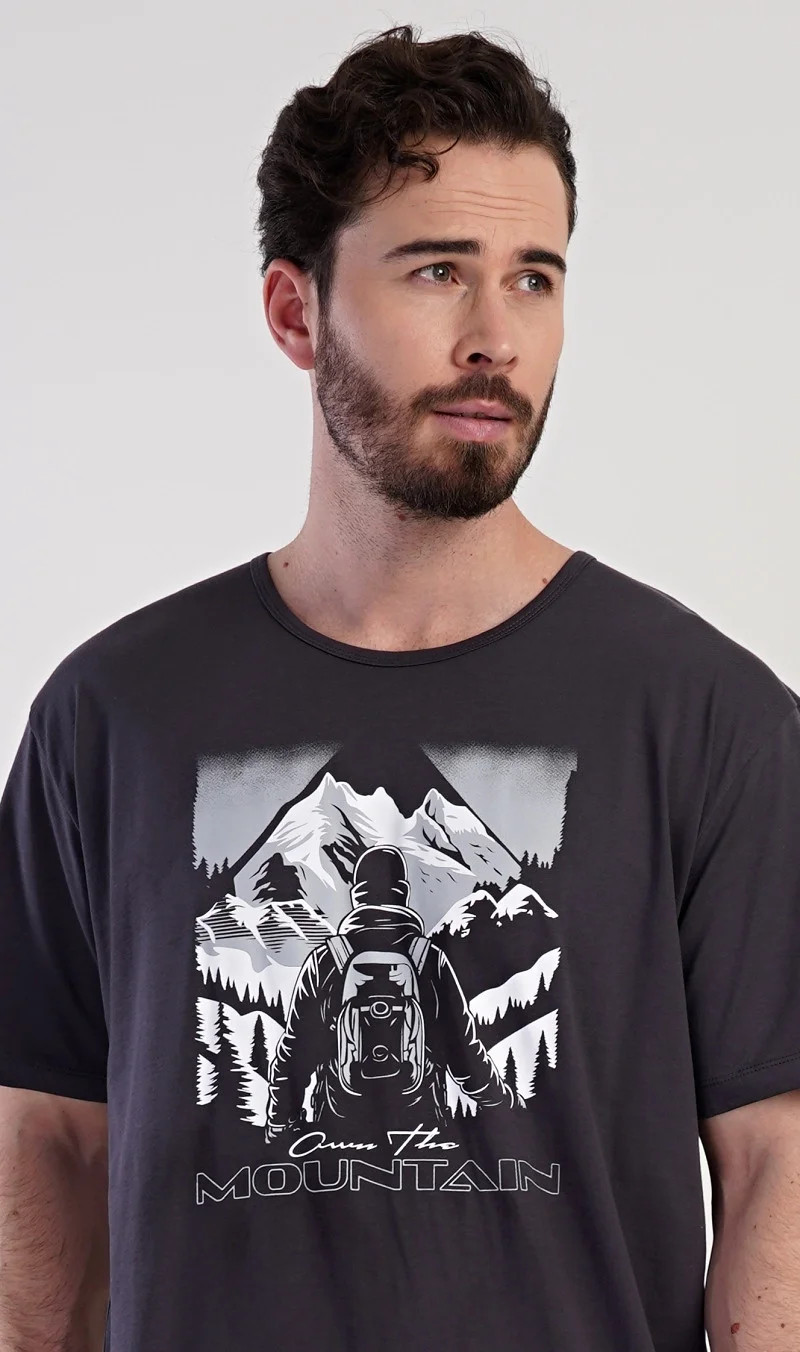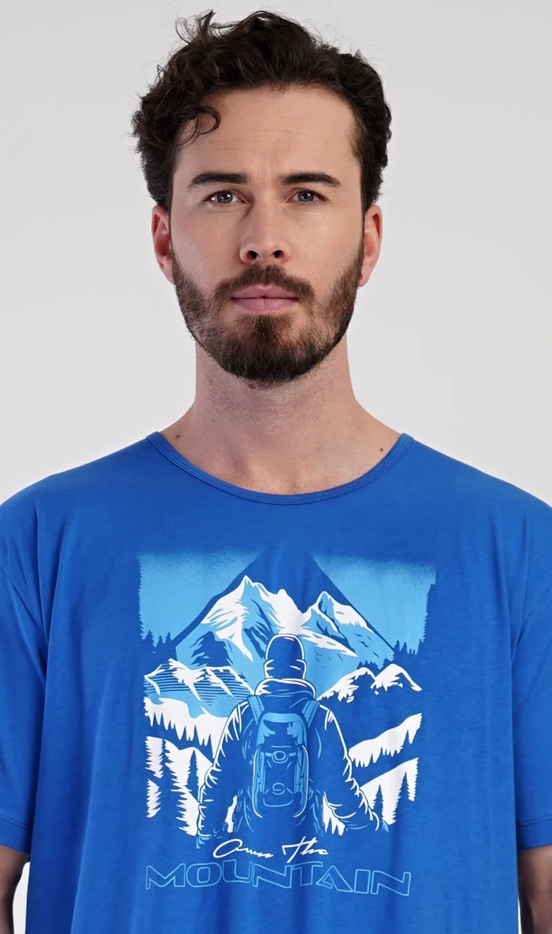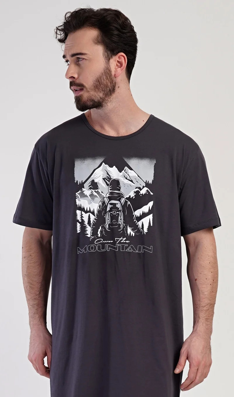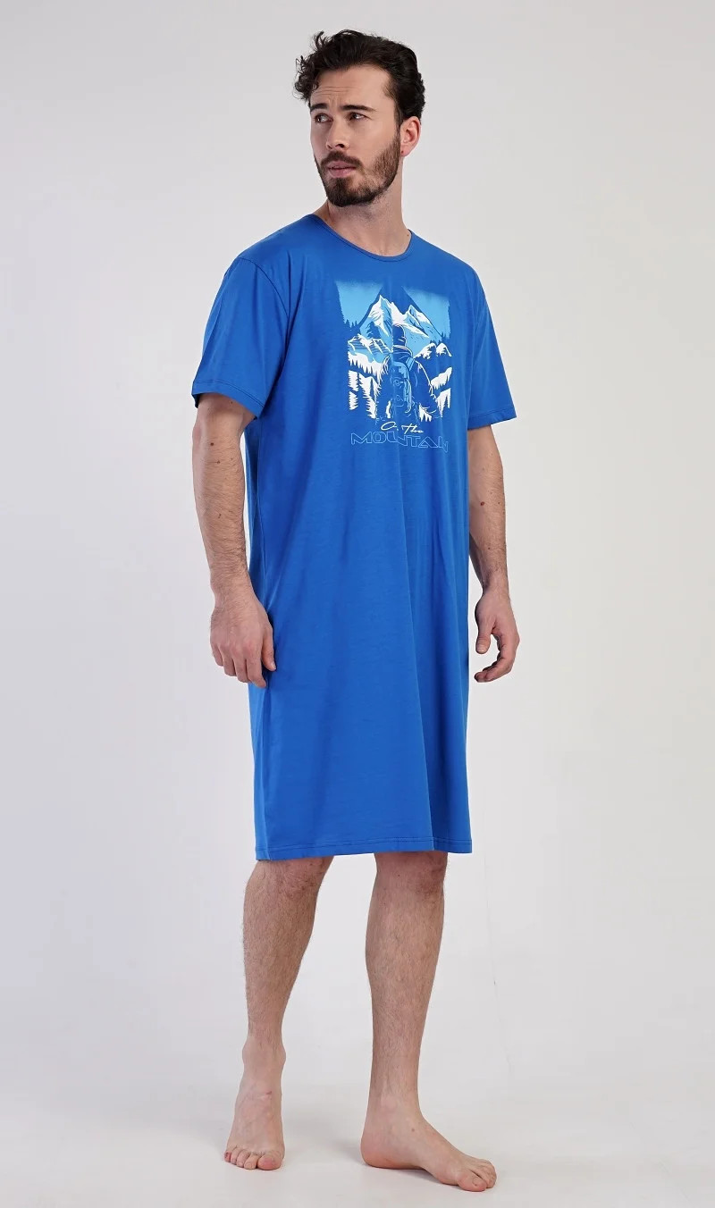 Pánská bavlněná noční košile s krátkým rukávem Mountain. Jednobarevná pánská noční košile s kulatým výstřihem je zdobena obrázkem muže, který jde zdolávat hory a nápisem 'Mountain'. Tato košile je vhodným dárkem pro všechny milovníky hor a turistiky. Použitý materiál je příjemný a poddajný na dotek. Obsah bavlny je 100%.