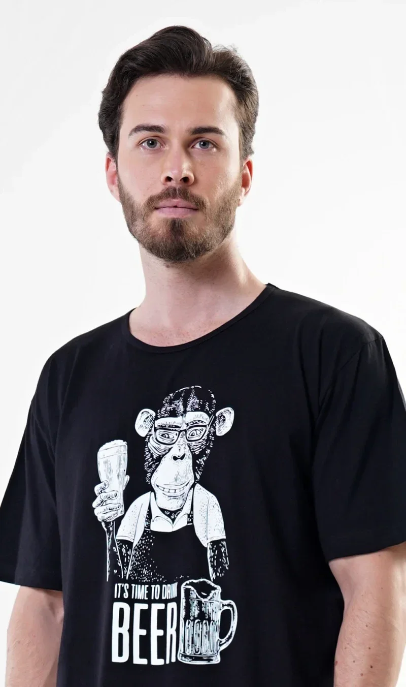 Pánská bavlněná noční košile s krátkým rukávem Opice. Pánská noční košile pro všechny milovníky pohodlí s obrázkem šimpanze - barmana s pivem. Použitý bavlněný materiál je příjemný a poddajný na dotek.