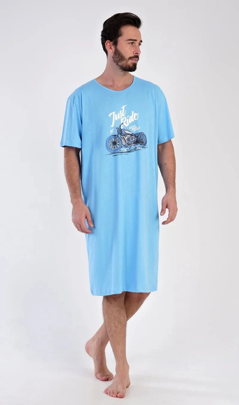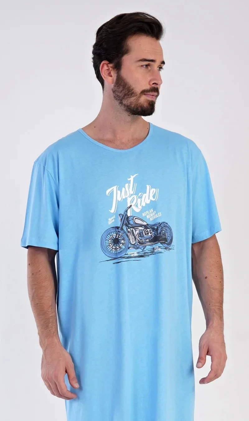 Pánská bavlněná noční košile s krátkým rukávem Samuel. Jednobarevná pánská noční košile s kulatým výstřihem je zdobena větším obrázkem motorky a nápisem JUST RIDE. Tato košile je vhodným dárkem pro všechny milovníky motorek. Použitý materiál je příjemný a poddajný na dotek. Obsah bavlny je 100%.
