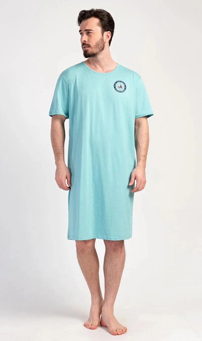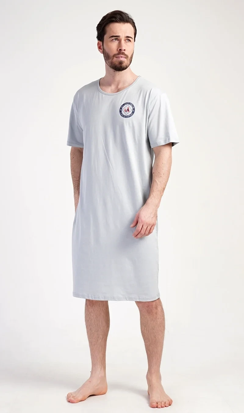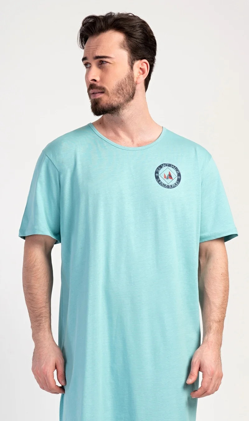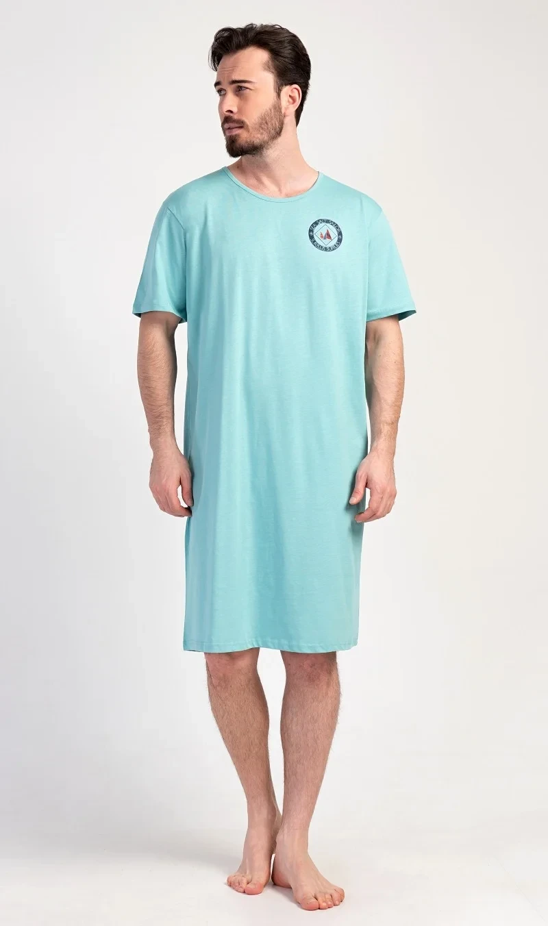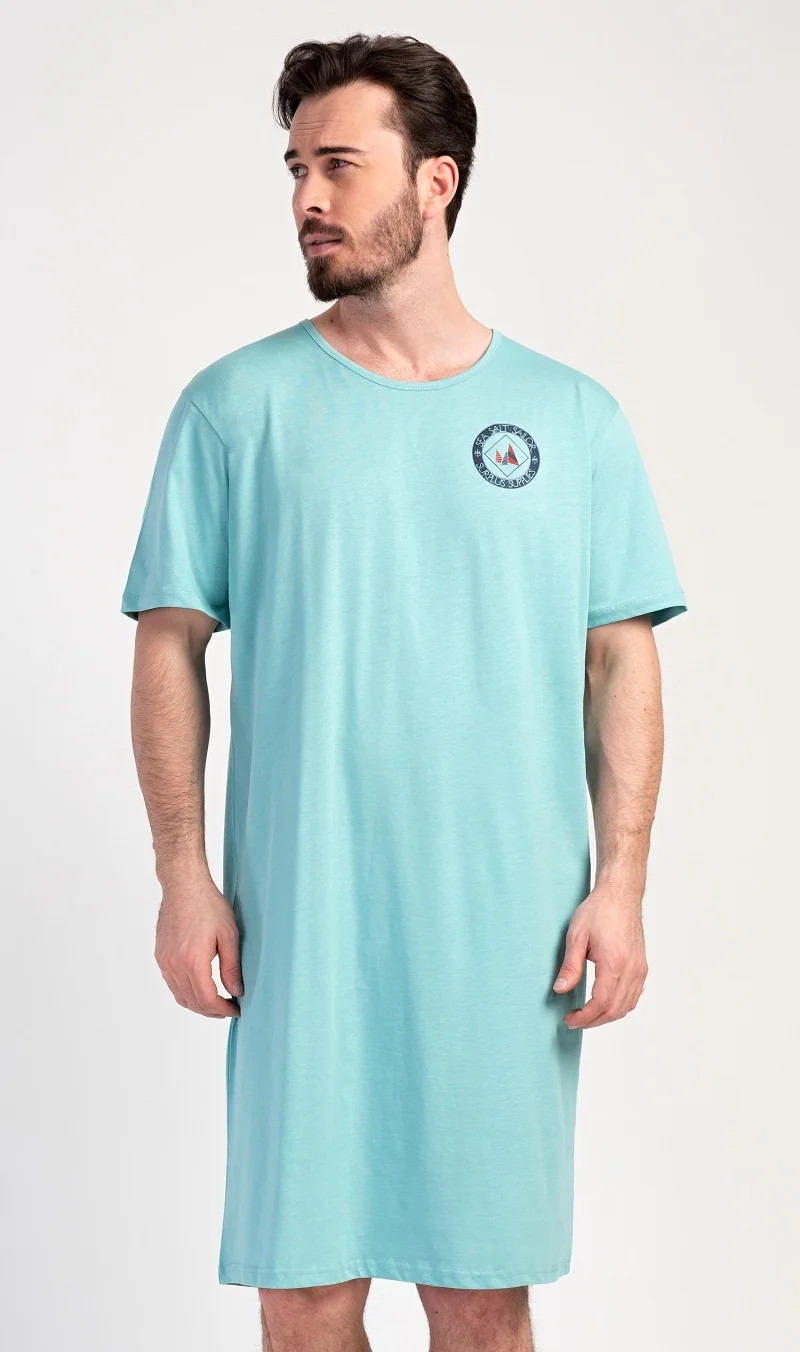 Pánská bavlněná noční košile s krátkým rukávem Sea. Jednobarevná pánská noční košile s kulatým výstřihem a délkou po kolena je zdobena decentním obrázkem s námořnickým motivem. Použitý materiál je příjemný a poddajný na dotek. Obsah bavlny je 100%.