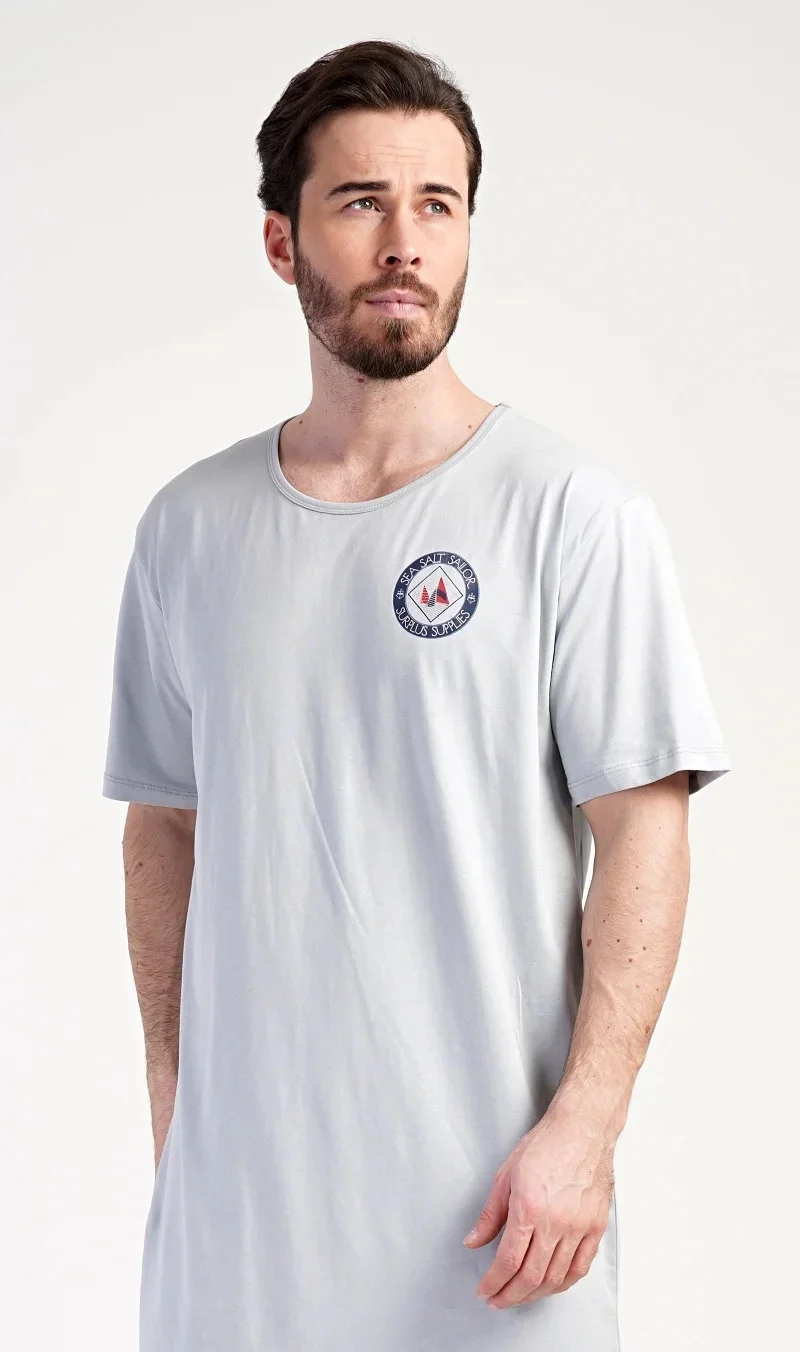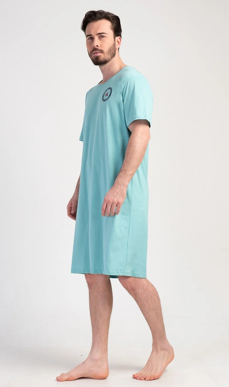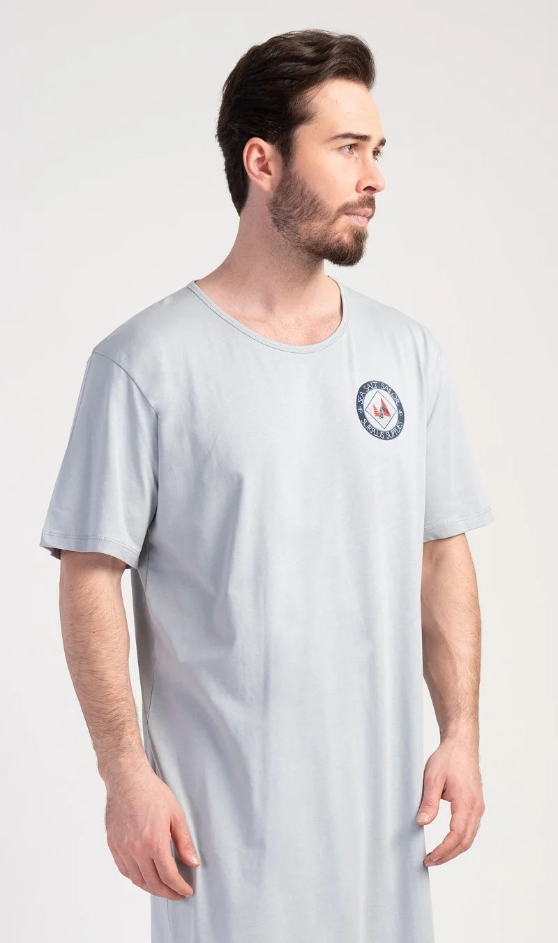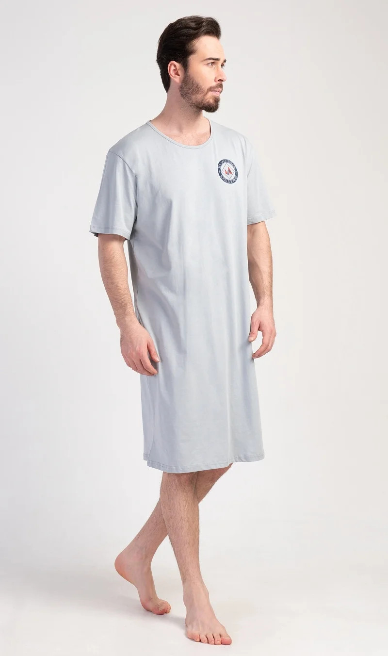 Pánská bavlněná noční košile s krátkým rukávem Sea. Jednobarevná pánská noční košile s kulatým výstřihem a délkou po kolena je zdobena decentním obrázkem s námořnickým motivem. Použitý materiál je příjemný a poddajný na dotek. Obsah bavlny je 100%.