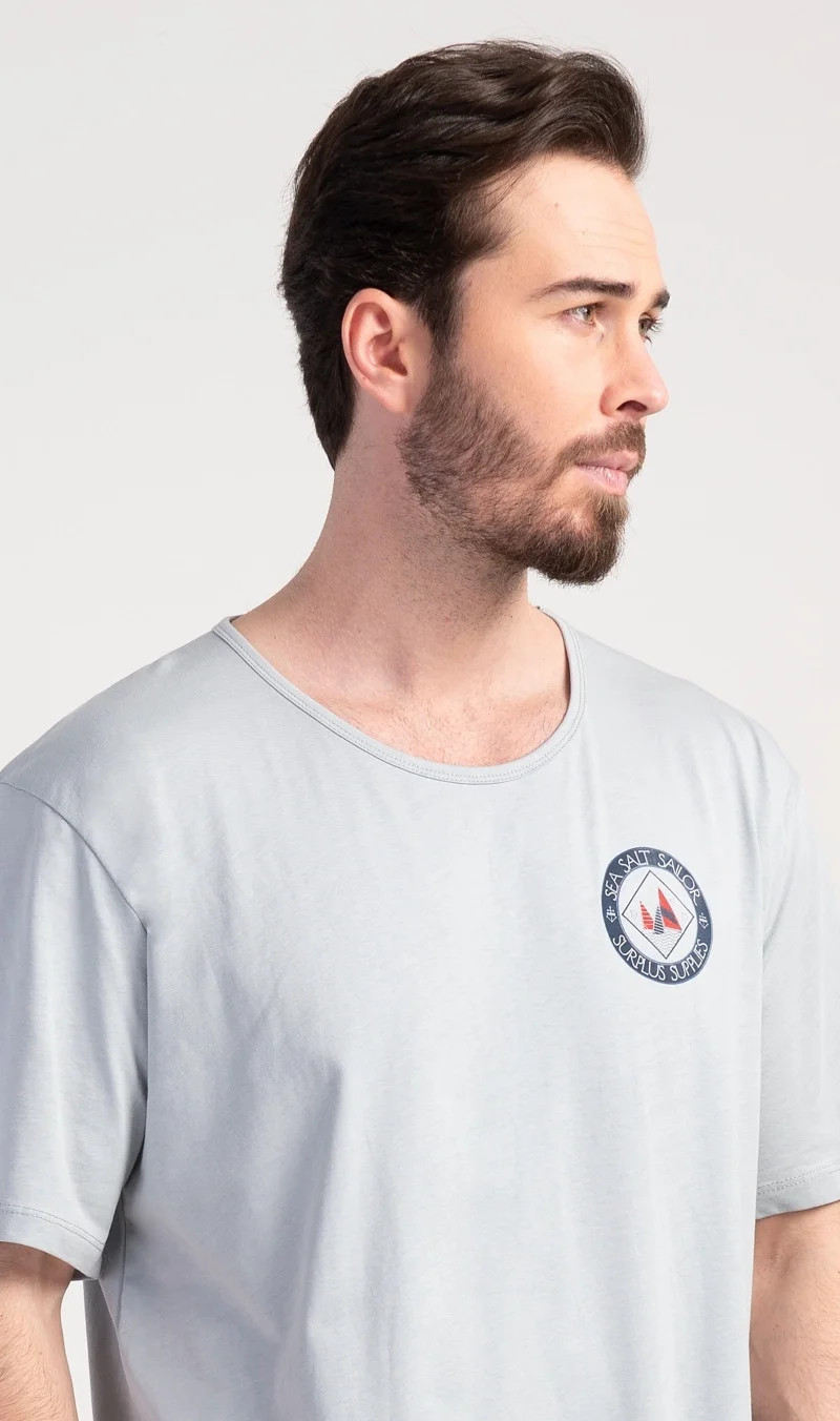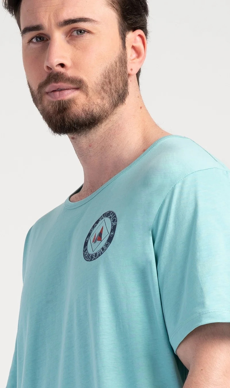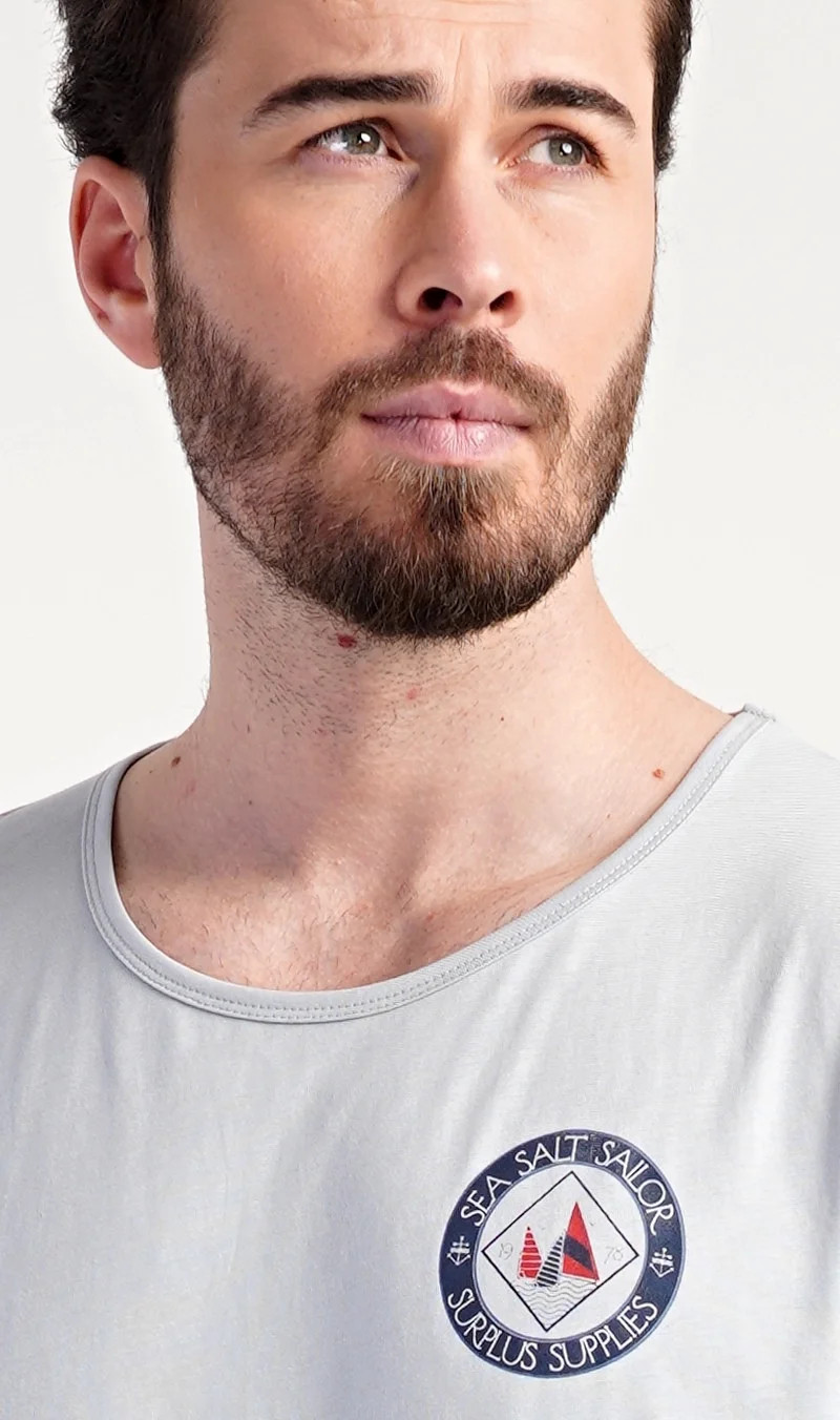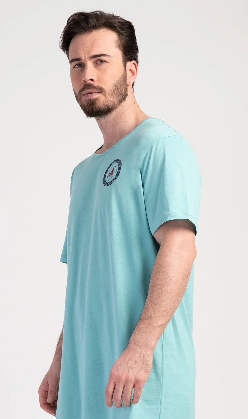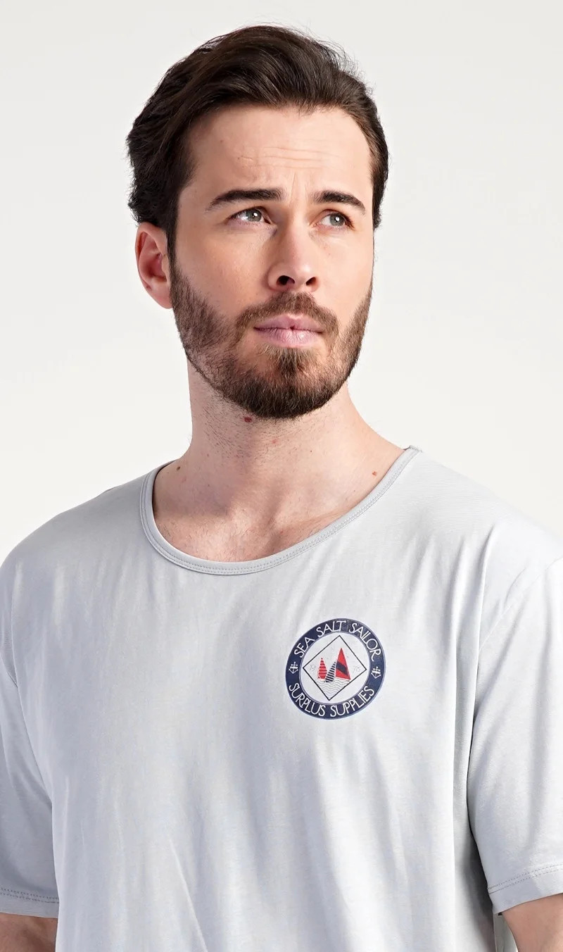 Pánská bavlněná noční košile s krátkým rukávem Sea. Jednobarevná pánská noční košile s kulatým výstřihem a délkou po kolena je zdobena decentním obrázkem s námořnickým motivem. Použitý materiál je příjemný a poddajný na dotek. Obsah bavlny je 100%.