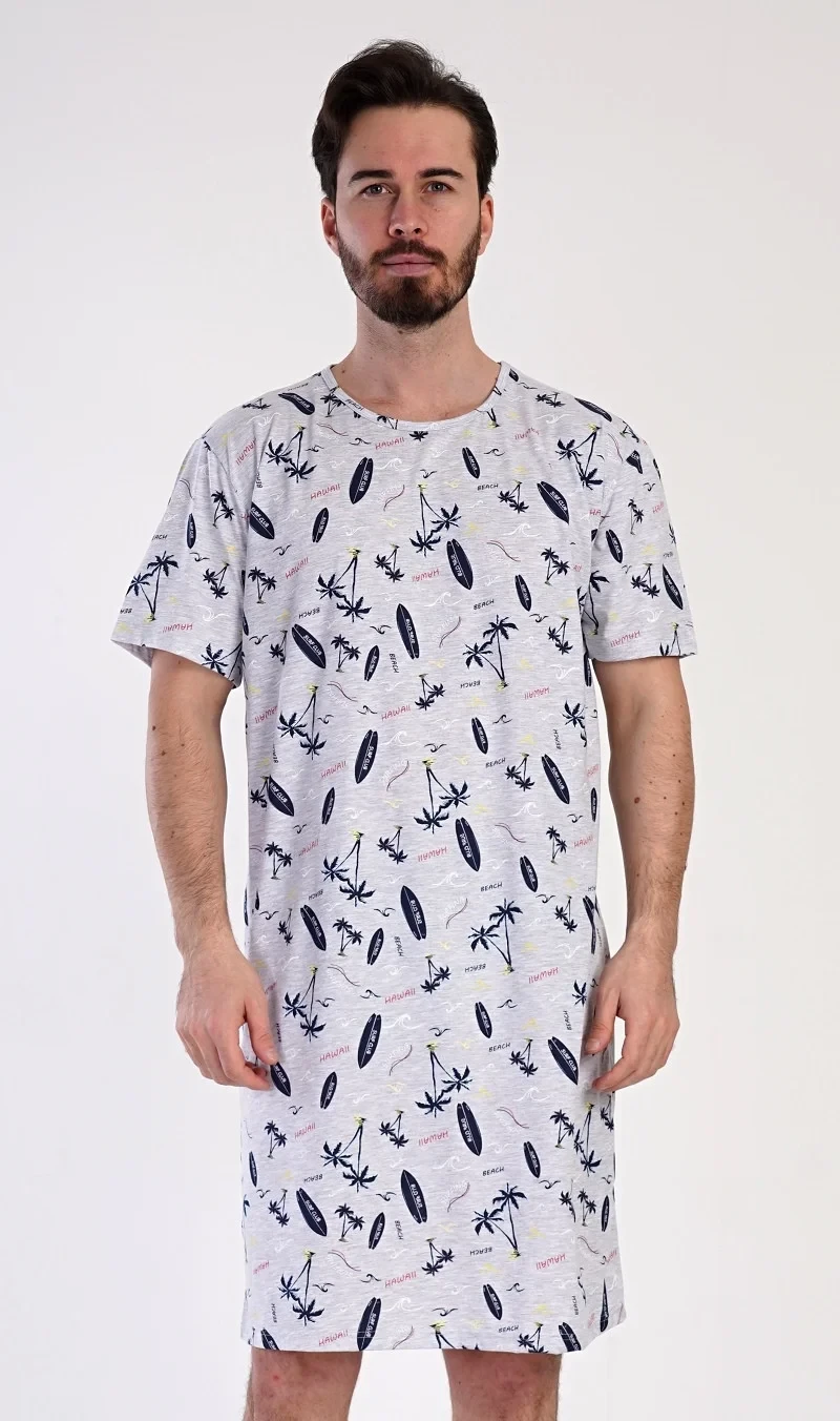 Pánská noční košile s krátkým rukávem Surfing. Jednobarevná pánská noční košile s kulatým výstřihem je zdobena obrázky a nápisy v surfařském stylu. Tato košile je vhodným dárkem pro všechny milovníky moře a exotiky. Použitý materiál je příjemný a poddajný na dotek. Obsah bavlny je 70%.