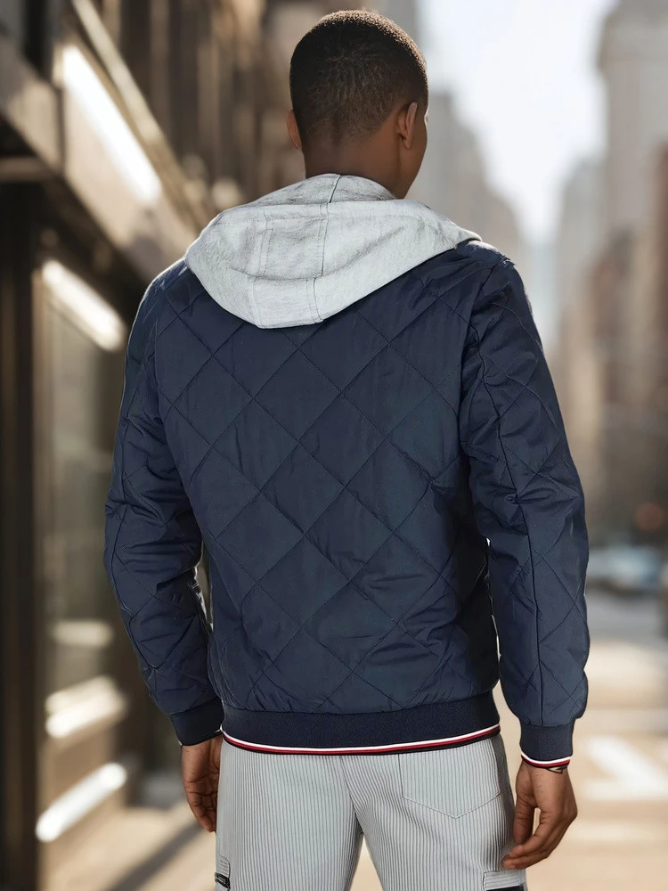 Tato pánská prošívaná bunda na zip je ideálním řešením pro přechodné dny. Lehká, vyplněná konstrukce zajišťuje tepelný komfort, zatímco odnímatelná nastavitelná kapuce dodává celkovému vzhledu styl. Dvě vnější kapsy a jedna vnitřní kapsa poskytují pohodlné uložení drobností, zatímco žebrované manžety umocňují sportovní styl.