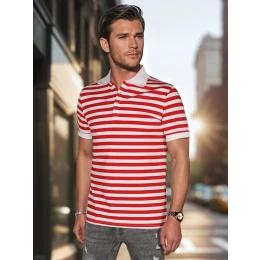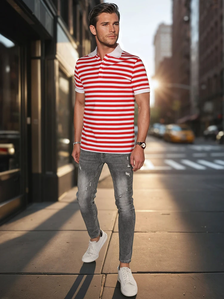 Koszulka polo męska w paski to klasyczny model z nowoczesnym twistem. Wykonana z miękkiego, przyjemnego w dotyku materiału, gwarantuje komfort noszenia przez cały dzień. Posiada zapięcie na guziki i dopasowany, ale swobodny krój, który świetnie układa się na sylwetce. Idealna na co dzień, jak i półformalne okazje w cieplejsze dni sezonu wiosennego oraz letniego.