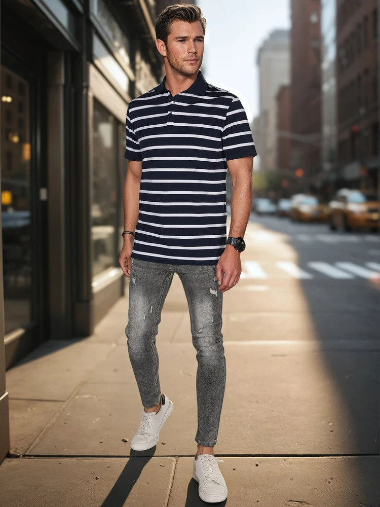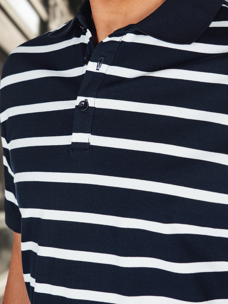 Koszulka polo męska o ponadczasowym fasonie, wykonana z miękkiego i przewiewnego materiału, który doskonale sprawdza się w cieplejsze dni. Klasyczny krój zapewnia komfort noszenia, a poziome paski i zapięcie na guziki dodają całości nowoczesnego stylu. Koszulka idealna na co dzień oraz do miejskich stylizacji. Świetna na sezon wiosenny.