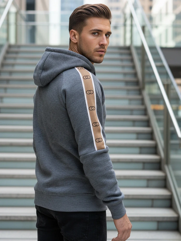 Wygodna bluza męska o sportowym kroju sprawdzi się w codziennych stylizacjach i aktywnościach na świeżym powietrzu. Miękki materiał zapewnia komfort noszenia, a klasyczny fason pozostaje uniwersalny przez cały rok. Regulowany kaptur zwiększa funkcjonalność, natomiast kontrastowe taśmy na rękawach nadają jej nowoczesnego i wyrazistego charakteru.