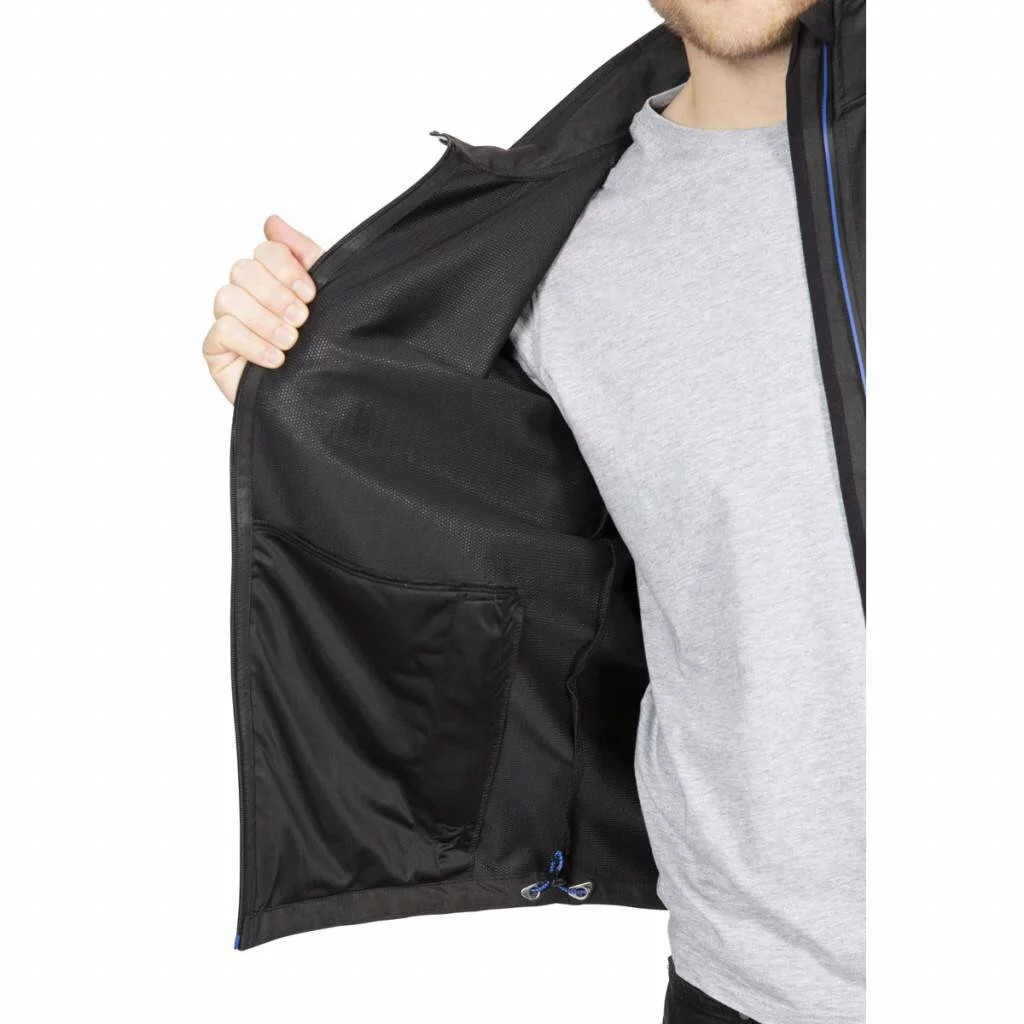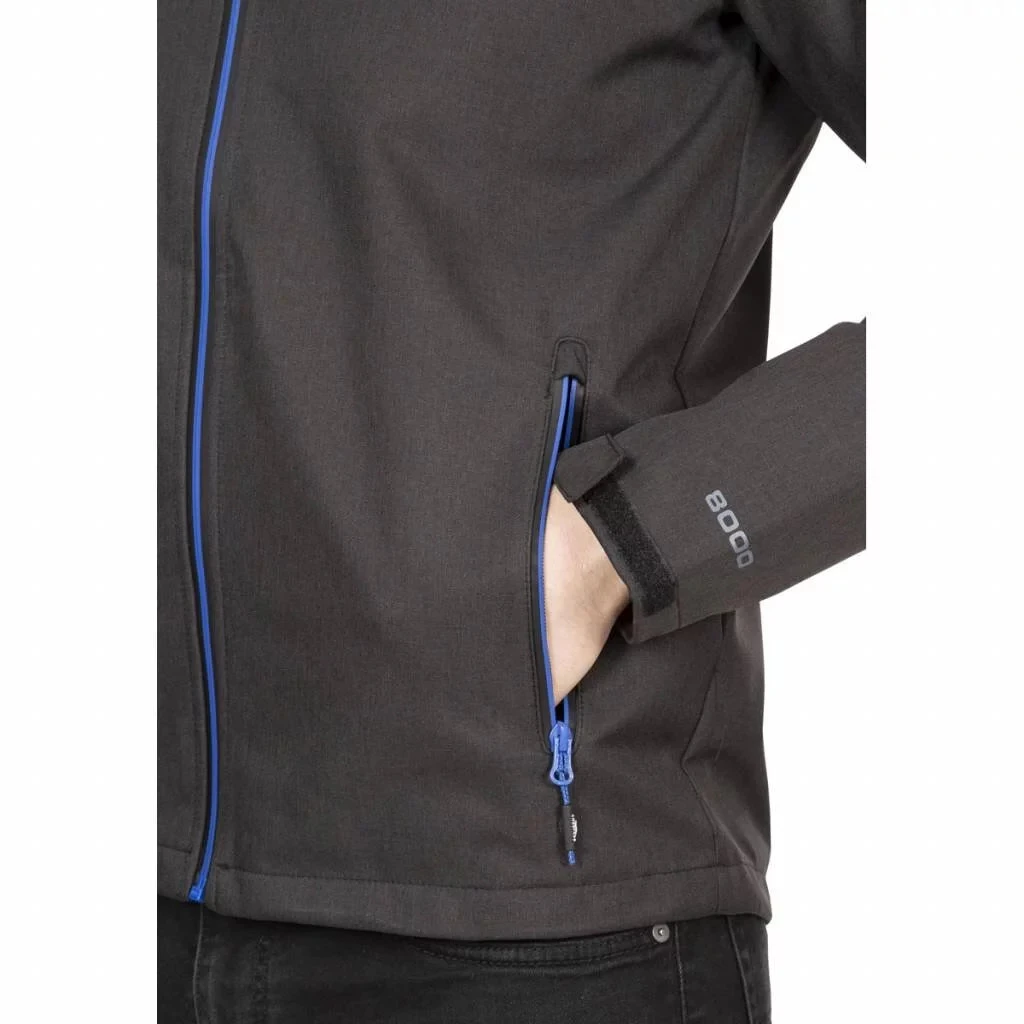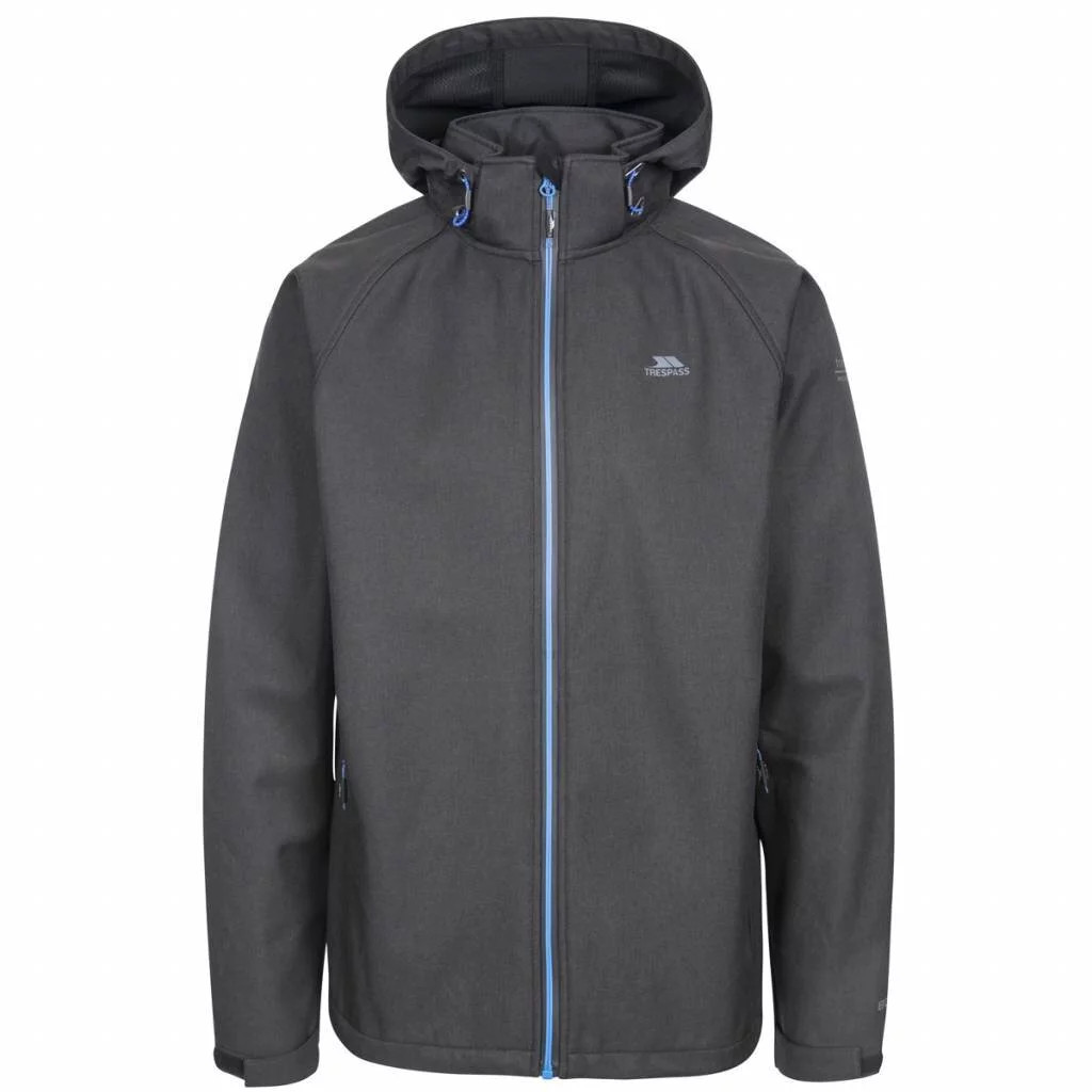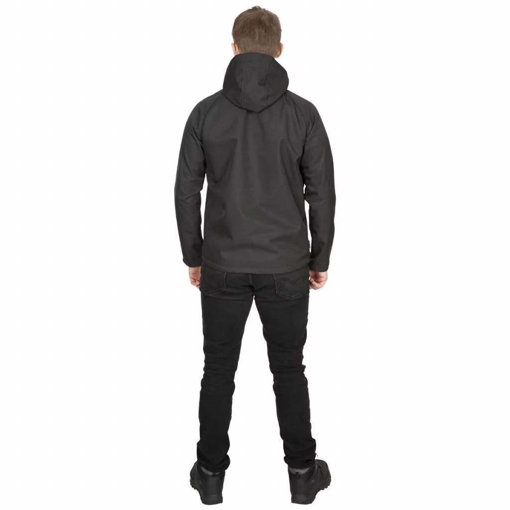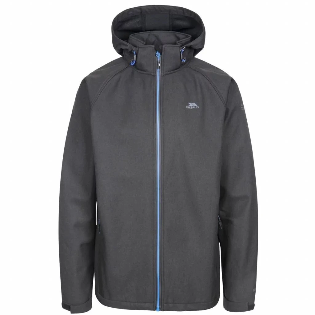 Pánská softshellová bunda Trespass na zip s kapucí vyrobena z větru odolné a nepromokavé tkaniny o parametru 8000mm a prodyšnosti 3000mvp.