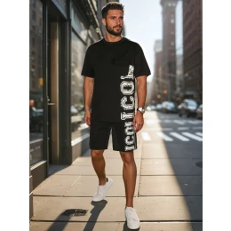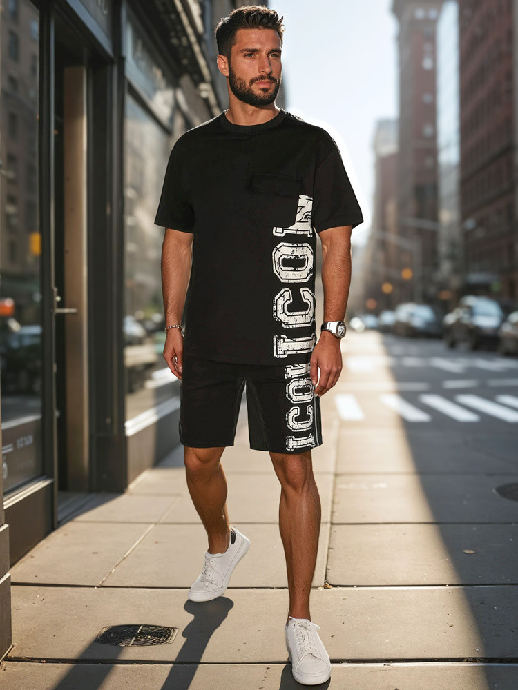 Męski komplet dresowy składający się z t-shirta i krótkich spodenek to nowoczesna propozycja dla fanów wygodnego stylu. Koszulka posiada oryginalny nadruk z napisem "ICON" i kieszonkę z klapką, a krótkie spodenki wyposażone są w elastyczny pas ze sznurkiem oraz zamki w kieszeniach. Całość świetnie sprawdza się w miejskich stylizacjach, na ciepłe dni wiosny.