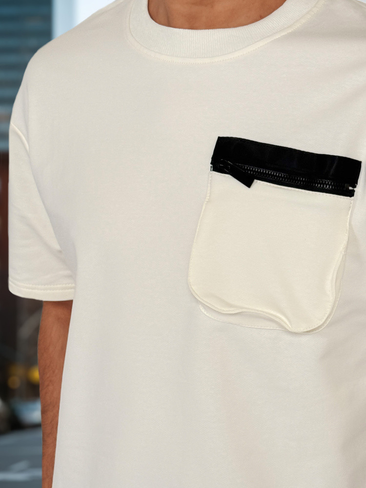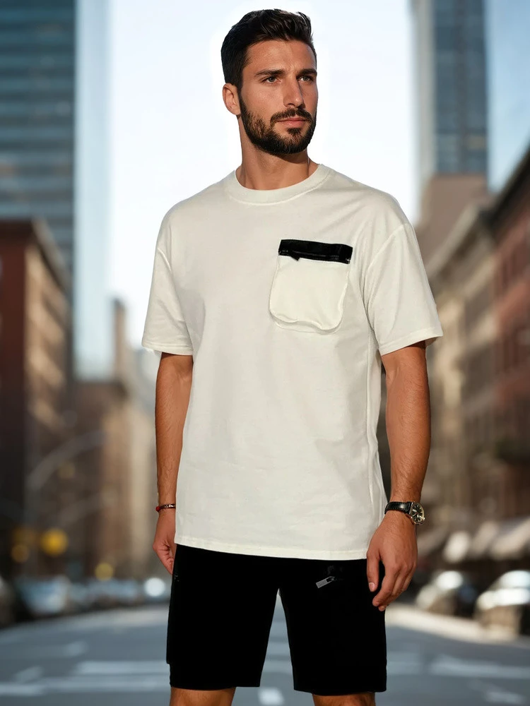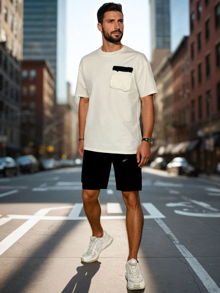 Dwuczęściowy męski komplet dresowy to propozycja z modnym charakterem. Koszulka z krótkim rękawem wyróżnia się ozdobną kieszenią na piersi, zapinaną na suwak. Zaokrąglony dekolt i dopracowany krój zapewniają komfort przez cały dzień. Spodenki typu cargo posiadają cztery kieszenie, miękki ściągacz w pasie oraz sznurek do regulacji. Całość wykonana z przyjemnego materiału, który świetnie sprawdza się w wiosenne dni, zarówno w mieście, jak i podczas aktywności.