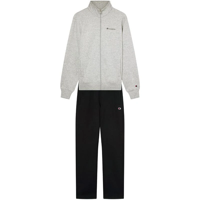 Dres męski Champion Sweatsuit czarno-szary 221786 EM021 Dres dla mężczyzn adidas sprawdzi się podczas codziennego użytkowania. W komplecie bluza i spodnie dresowe. Bluza ze stójką ma zamek na całej długości. Jej dolną część i rękawy wyposażono w ściągacze. Spodnie dresowe z elastyczną talią i wsuwanymi kieszeniami wykończono nogawkami bez ściągaczy. Bluza i spodnie posiadają kieszenie. Materiał główny: 55% bawełna, 45% poliester