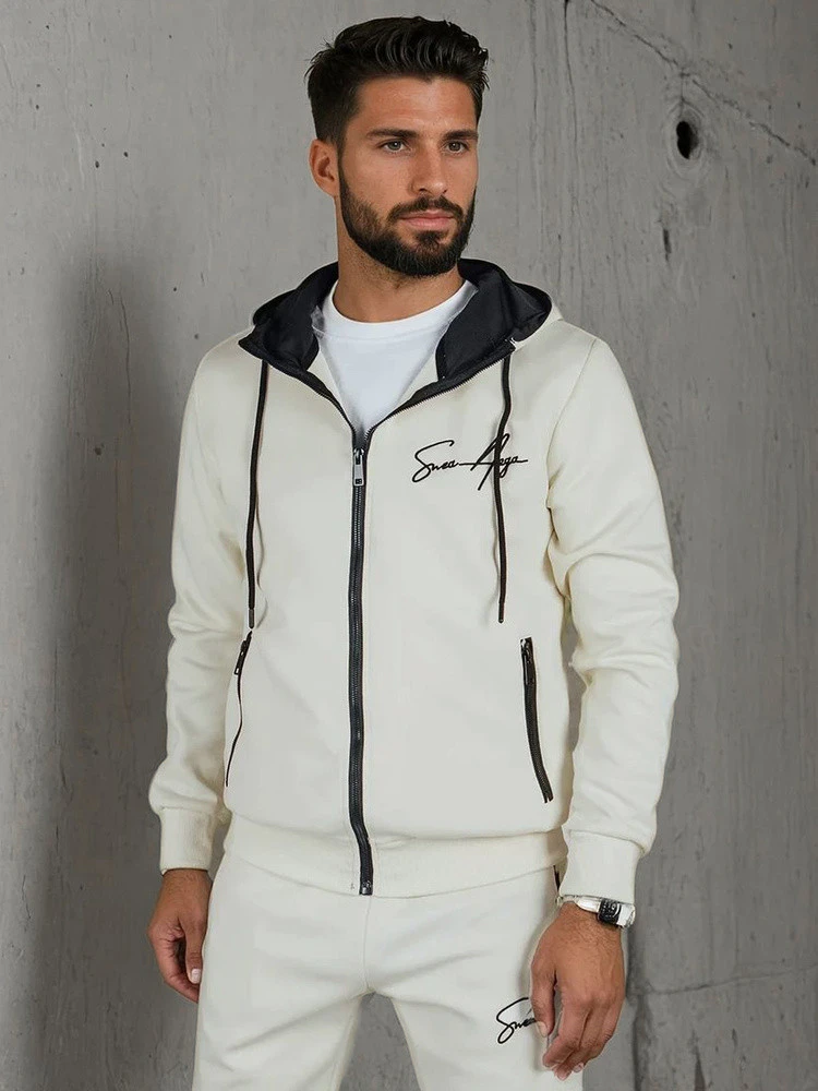 Męski komplet dresowy z bluzą na zamek i spodniami typu jogger z dopasowanymi nogawkami. Charakterystyczny haft dodaje całości nowoczesnego charakteru, a miękka dzianina zapewnia wygodę podczas noszenia. Funkcjonalne kieszenie i kaptur sprawiają, że zestaw sprawdzi się wiosną w codziennym użytkowaniu.