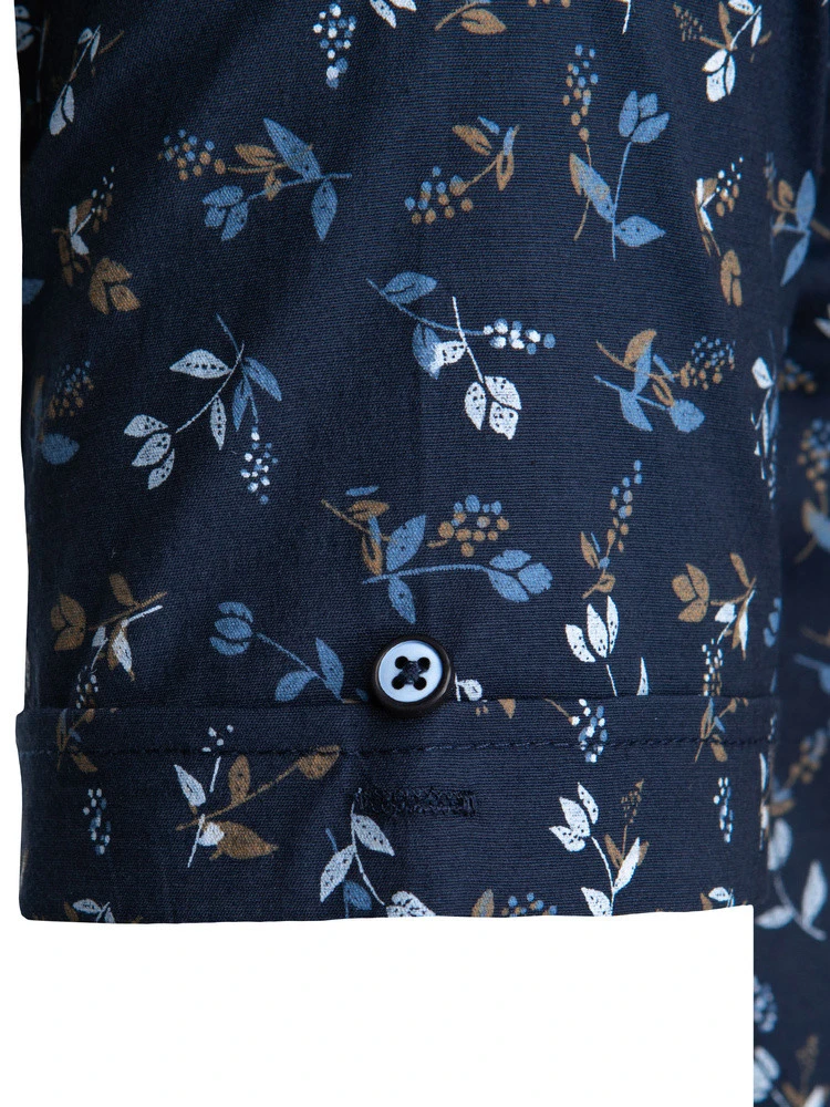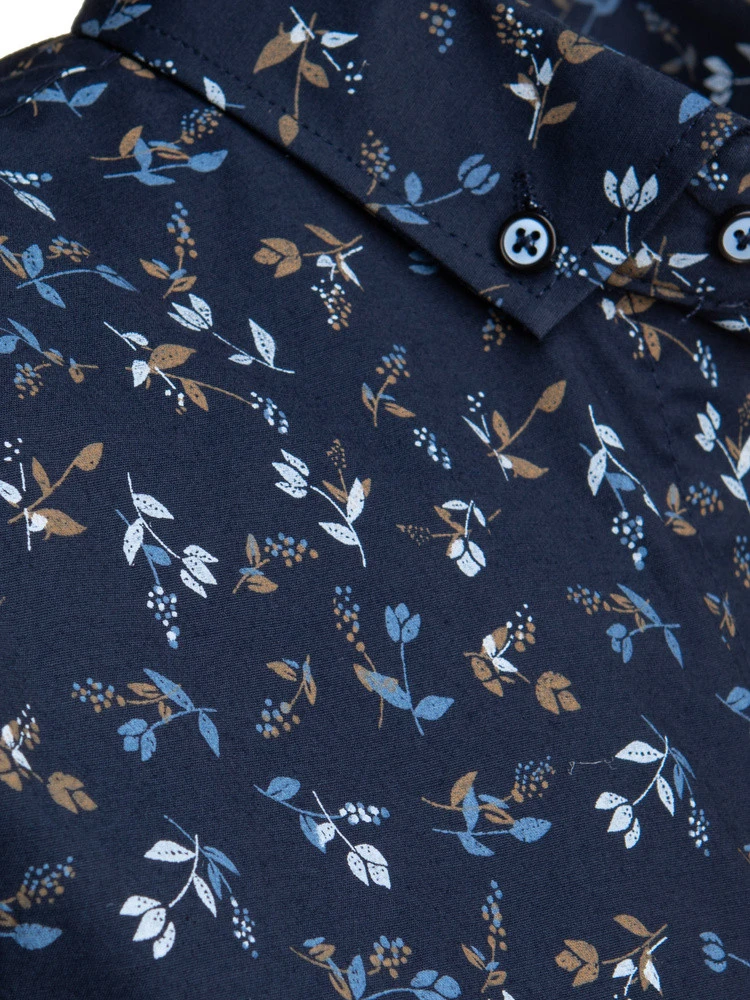 Wzorzysta koszula męska o kroju slim fit to propozycja dla mężczyzn ceniących modny design i wygodę noszenia. Delikatny nadruk w liście i gałązki ożywia klasyczny fason, dodając mu lekkości i wiosenno-letniego charakteru. Kołnierzyk zapinany na guziczki typu button-down świetnie prezentuje się zarówno solo, jak i pod lekką marynarką. Model doskonały do stylizacji z jeansami lub spodniami chino.