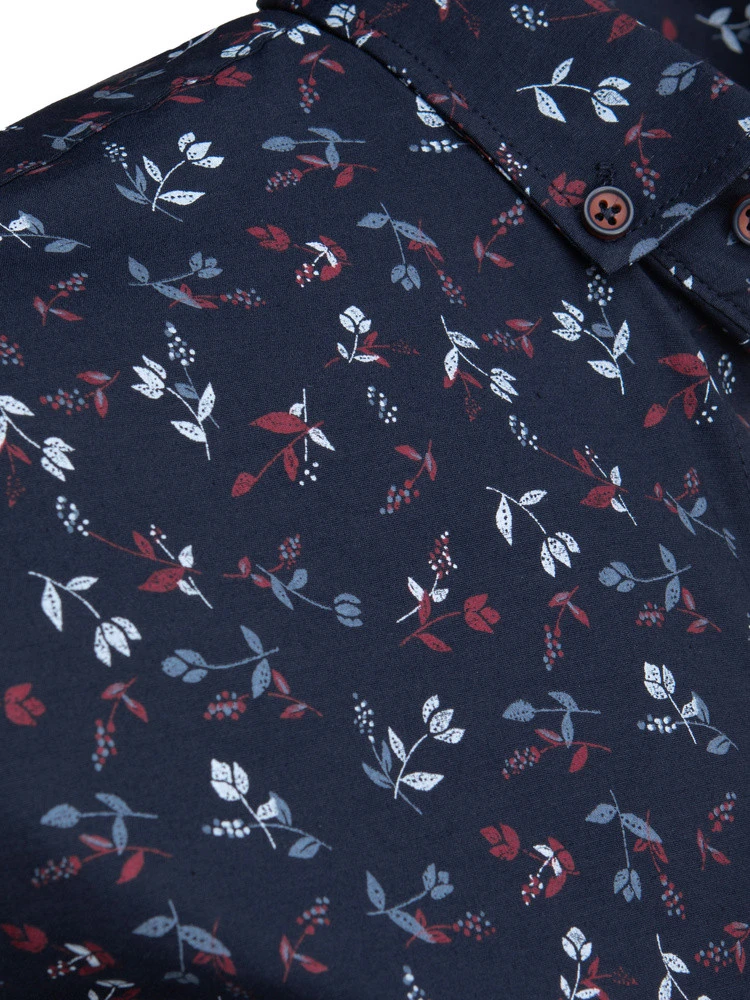 Tato pánská košile s krátkým rukávem slim fit střihu je skvělou volbou pro teplejší měsíce. Listový a květinový vzor dodává košili svěžest a charakter, zatímco knoflíkový límec a zapínání na knoflíky jí dodávají elegantní vzhled. Ideální pro ležérní i elegantní styling - ideální na jarní schůzky nebo letní výlety.