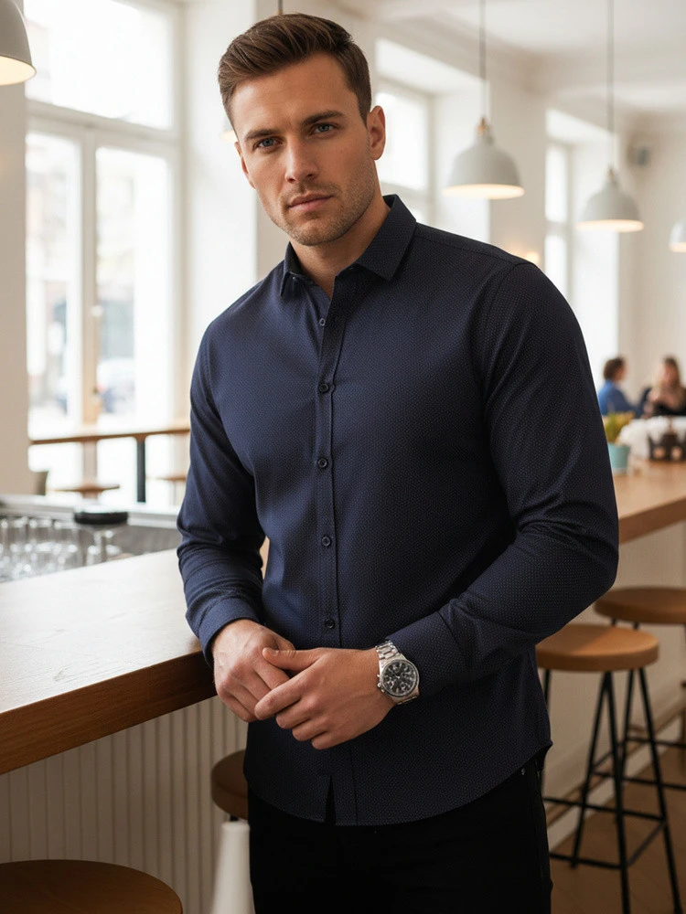 Pánská košile slim fit střihu zvýrazňuje siluetu a dodává stylizaci moderní nádech. Je vyrobena z kvalitní bavlny s přídavkem elastanu a poskytuje pohodlí a volnost pohybu. Jemný drobný vzor dodává eleganci a předurčuje model k pracovnímu i elegantnímu ležérnímu stylu. Pečlivě zpracované detaily zdůrazňují estetiku a univerzálnost střihu.