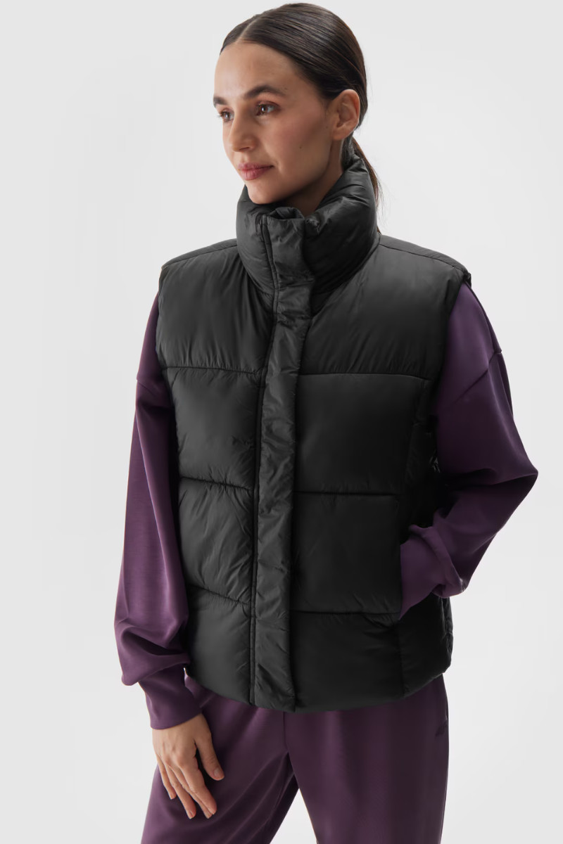 Dámský bezrukávník je vyplněn syntetickým peřím, které je odolnější a snadněji se udržuje než přírodní peří. I při kontaktu s vlhkostí si uchovává své izolační vlastnosti po delší dobu a mnohem rychleji schne. Navíc nevyžaduje složitý proces praní a sušení. Hydrofoobní impregnační povlak pokrývá vnější vrstvu materiálu a chrání ji před absorpcí vody. Povlak způsobuje, že se vlhkost kondenzuje na povrchu tkaniny nebo úpletu, po čemž volně stéká. Krk chrání vysoký límec, který dodatečně chrání před chladem a větrem. Na bocích se nacházejí 2 otevřené kapsy. Dámský bezrukávník je zapínán na jednosměrný hlavní zip s vnitřní protivětrnou légou, která omezuje pronikání chladu do interiéru bundy. Obvod dolní části lze regulovat pomocí tunelového stahovacího mechanismu se zarážkami. Hlavní materiál: 100% polyamid. Podšívka: 100% polyamid. Výplň: 100% polyester.