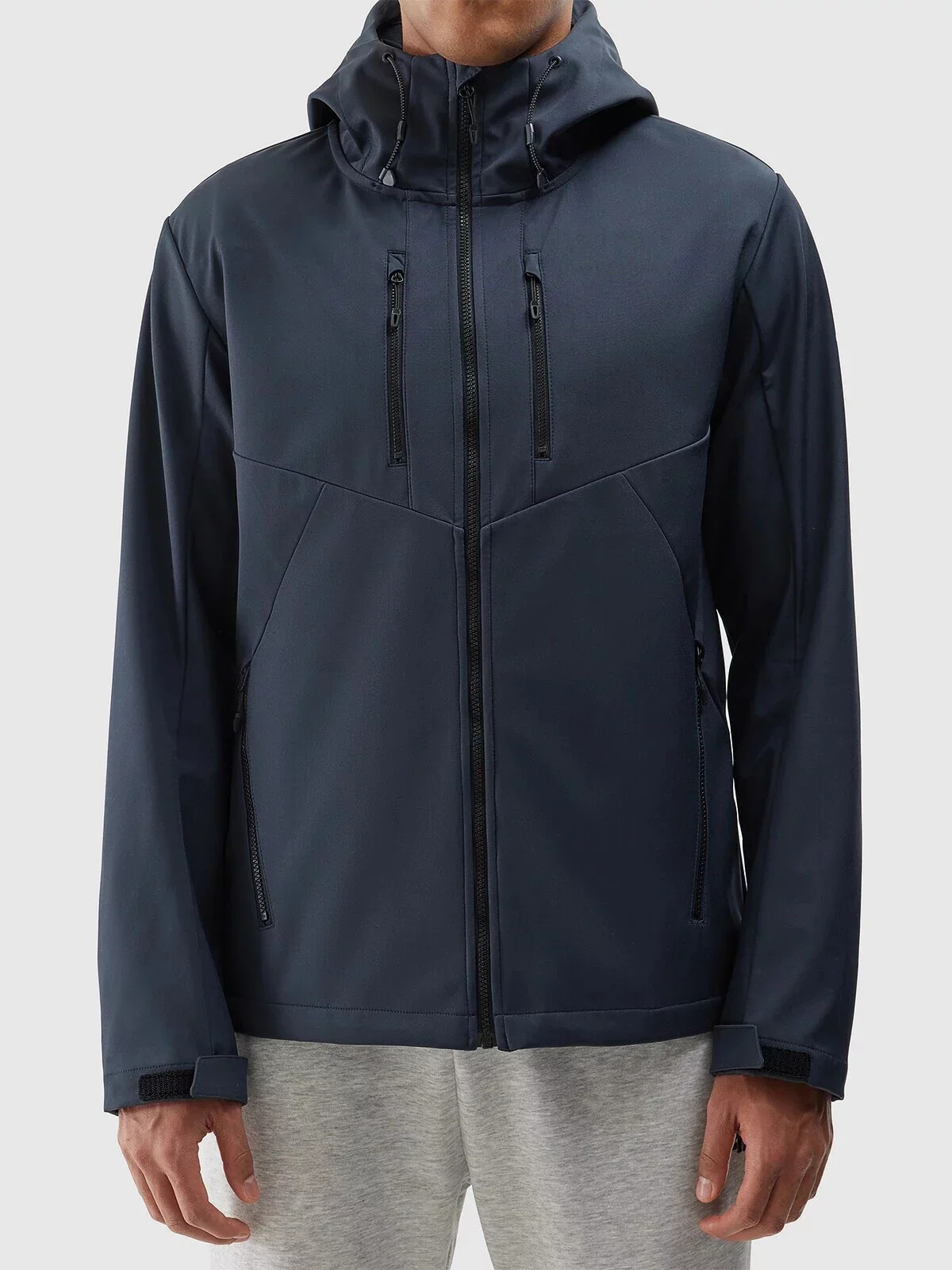 Pánská bunda typu softshell se zapíná na jednosměrný hlavní zip s vnitřní větruodolnou légou, která omezuje pronikání chladu dovnitř bundy, zatímco obvod spodní části lze upravit pomocí tunelové stahovací šňůrky se stopery.