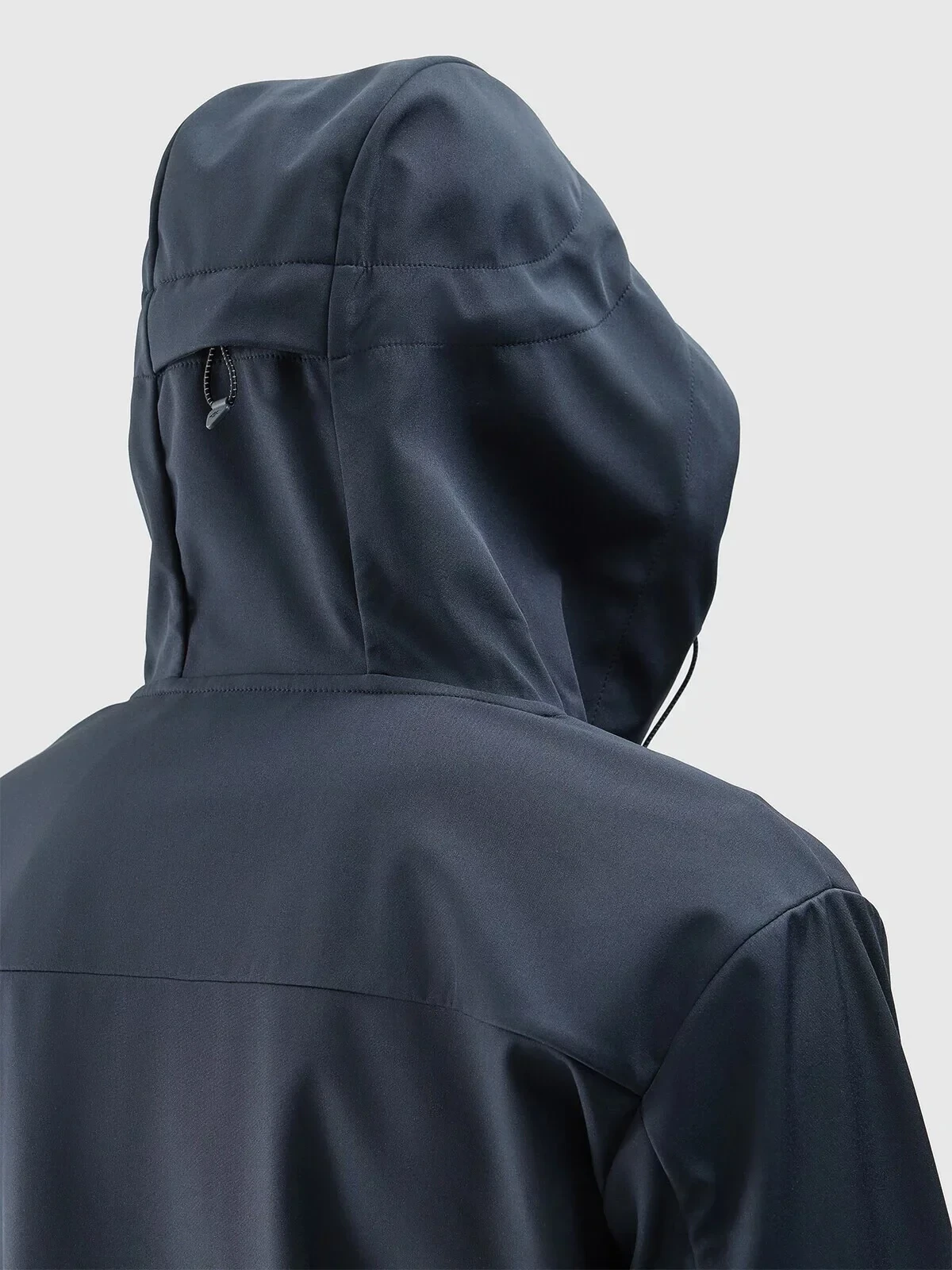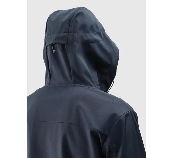 Pánský softshell s kapucí je vybavený integrovanou kapucí s možností regulace objemu a hloubky. Krk je krytý vysokým límcem, který dále chrání před chladem a větrem. Rukávy jsou zakončeny manžetami s nastavením na suchý zip. V podpaží se nachází větrání uzavíratelné pomocí jednosměrného zipu krytého ve švu, který umožňuje regulovat proudění vzduchu.