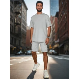 Pánská tepláková souprava kombinuje pohodlí s módním městským stylem. Tričko s krátkým rukávem má ozdobnou kapsu na rameni, zatímco cargo šortky mají až čtyři kapsy a elastický pas s nastavitelnou šňůrkou. Celá souprava je vyrobena z měkké tkaniny, která je ideální pro jarní dny a každodenní městské aktivity.