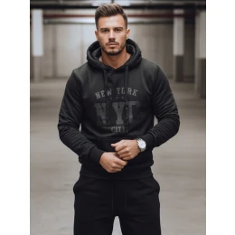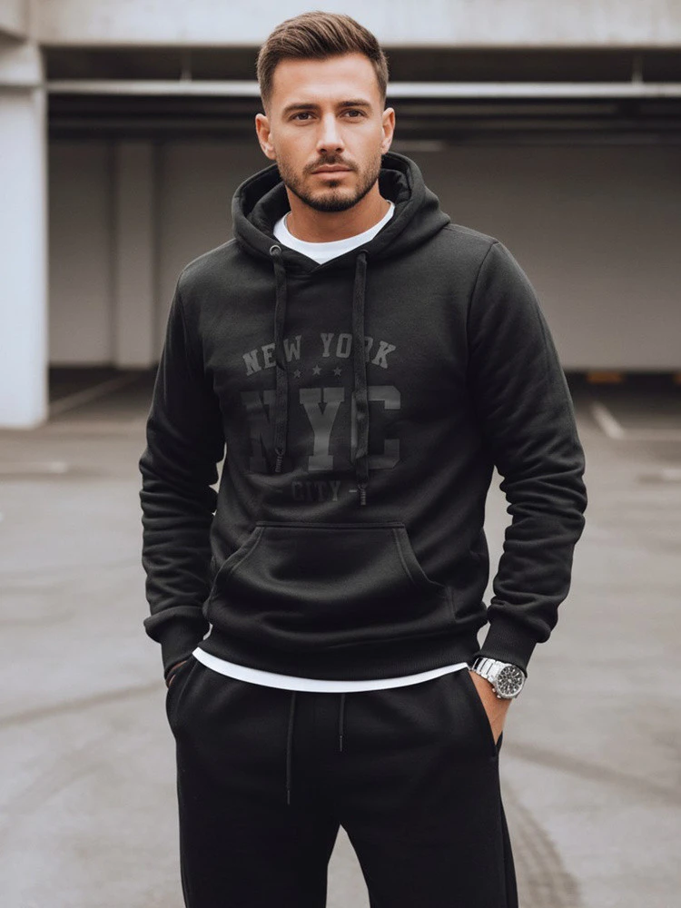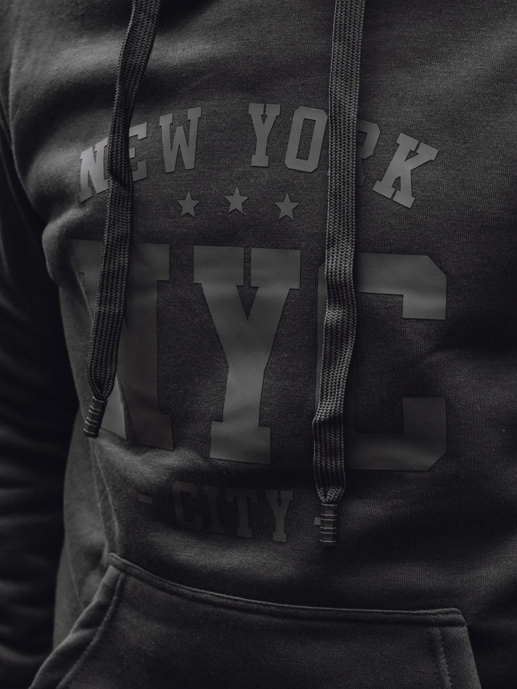 Bluza męska z nadrukiem na froncie w stylu miejskim, wykonana z miękkiego materiału z ociepleniem meszkiem polarowym od wewnątrz. Model prezentuje nowoczesny design z motywem "NYC" inspirowanym amerykańską modą streetwearową. Bluza posiada praktyczny kaptur regulowany sznurkami, kieszeń typu kangurka oraz elastyczne ściągacze przy rękawach i u dołu.