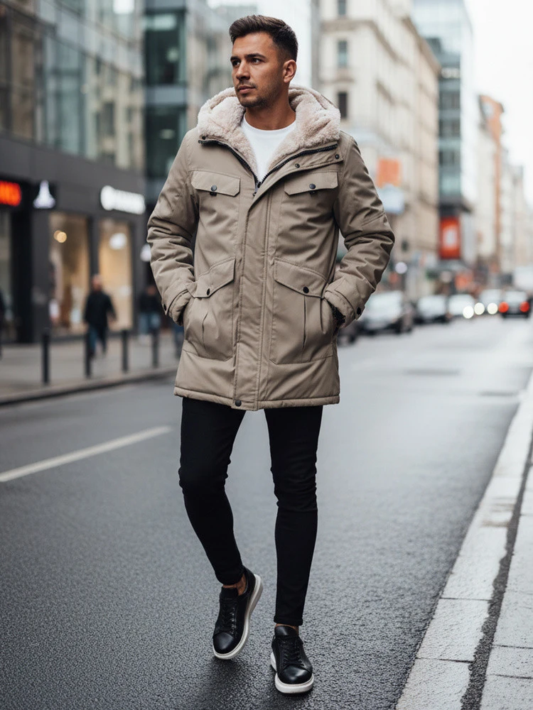 Stylowa kurtka zimowa dla mężczyzn, wyposażona w futrzany kołnierz dodający klasy i zapewniający dodatkowe ciepło. Wytrzymały materiał chroni przed niekorzystnymi warunkami atmosferycznymi, a funkcjonalne kieszenie zwiększają praktyczność. Nowoczesny design sprawia, że kurtka doskonale prezentuje się w miejskich stylizacjach, zapewniając komfort i swobodę ruchów.