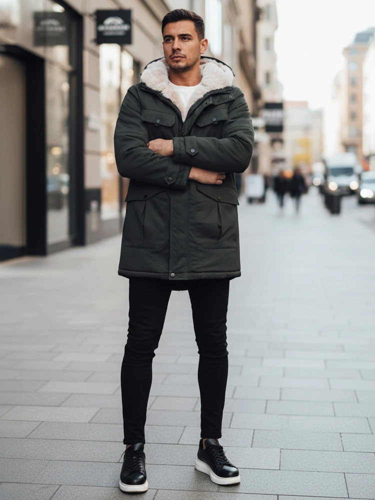 Stylová pánská zimní bunda s kožešinovým límcem, který dodává eleganci a hřeje. Odolný materiál chrání před nepříznivými povětrnostními podmínkami a funkční kapsy dodávají praktičnost. Díky modernímu designu je bunda ideální pro městský styl a poskytuje pohodlí a volnost pohybu.