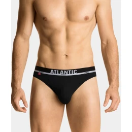 Černé pánské slipy jsou v pase označeny širokou a měkkou gumou s nápisem ATLANTIC. Kalhotky mají sportovně estetický - vysoce střižené boky a nízký pas zakončený již zmíněnou vnější gumou . Příjemná na dotek, měkká guma nestlačuje tělo a nelepí se do něj, takže nezpůsobuje nepohodlí.Kalhotky jsou vyrobeny z úpletu, který je kombinací bambusu , jemného jako hedvábí, příjemné bavlny a pružného elastanu. Tato pletenina je šetrná k pokožce a má termoregulační vlastnosti - dodává pocit chladu v horkém počasí a hřeje v zimě. Je odolný při používání a zachovává si své vlastnosti po dlouhou dobu používání.