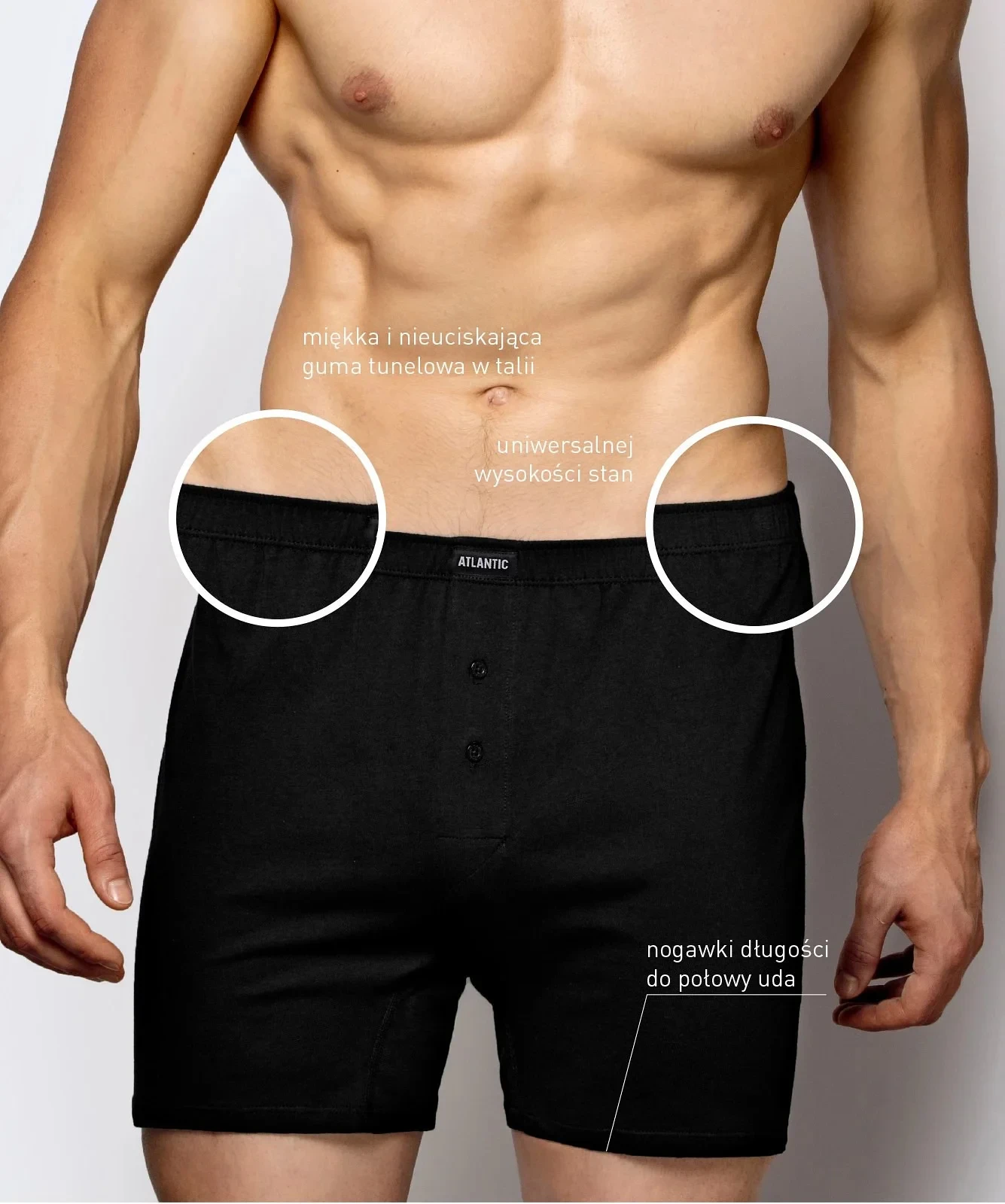 Model má ploché švy a v pase má gumu v tunýlku s nášivkou s logem "ATLANTIC". Okraje nohaviček netlačí při nošení do stehen. Boxerky jsou balené v krabičce po dvou kusech.