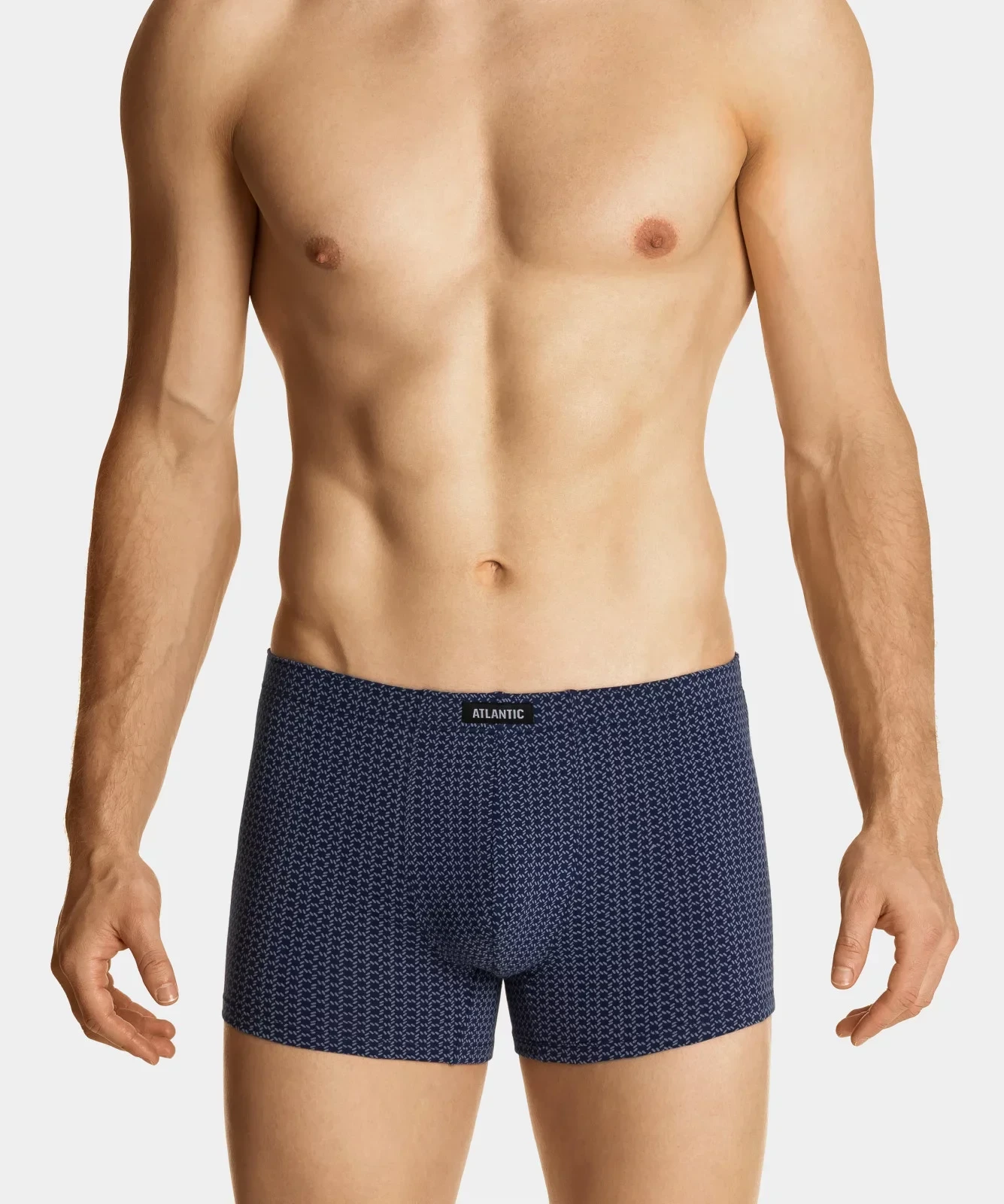 W opakowaniu znajdują się bokserki męskie w kolorze granatowym, ciemno-niebieskim i jasnym denimie. Bokserki mają sportowy krój - ich nogawki są standardowej długości, a stan jest niski. W talii bielizna wykończona jest miękką i nieuciskającą ciała gumą wewnętrzną. Majtki mają także profilujące szwy, co sprawia, że idealnie dopasowują się do ciała. Bokserki nie krępują ruchów, tym samym użytkownikowi zapewniają maksymalny poziom wygody. Wykonane są z miłej w dotyku bawełny połączonej z rozciągliwym elastanem. Dzianina jest odporna na wysokie temperatury oraz mechaniczne działanie, dzięki czemu swój kształt i kolor zachowuje przez długi czas użytkowania. Poza tym ma zdolność pochłaniania wody, nie doprowadza więc do dyskomfortu nadmiernego pocenia się ciała.