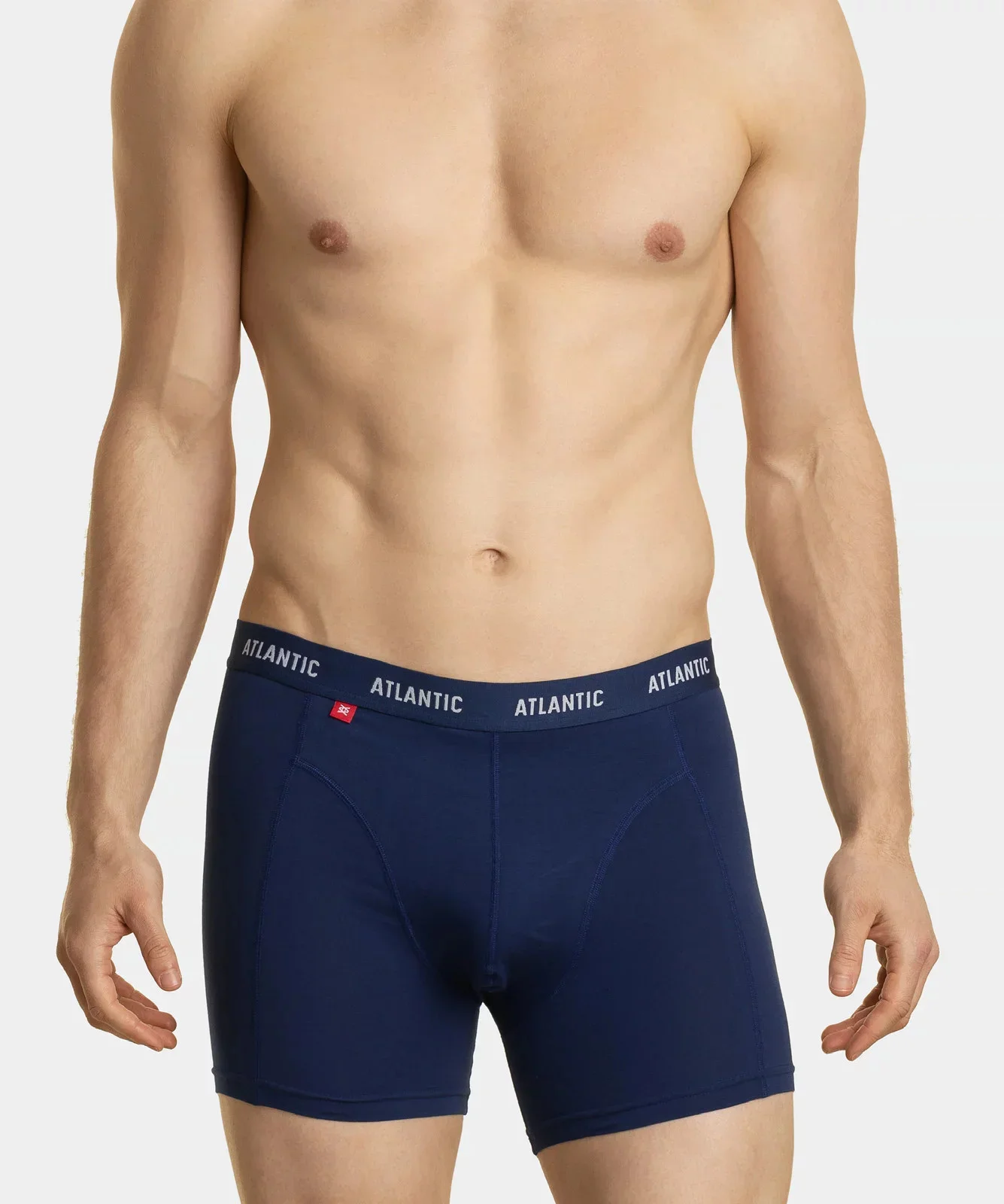 Bavlněné pánské boxerky s vnější gumou z mikrovlákna s nápisem Atlantic. Sportovní střih s krátkými nohavicemi, profilující střihy, poskytuje vysoký komfort a perfektně sedí na postavě. Vyrobeno z měkké bavlny s příměsí elastanu. Perfektní pro jakýkoli tvar těla.