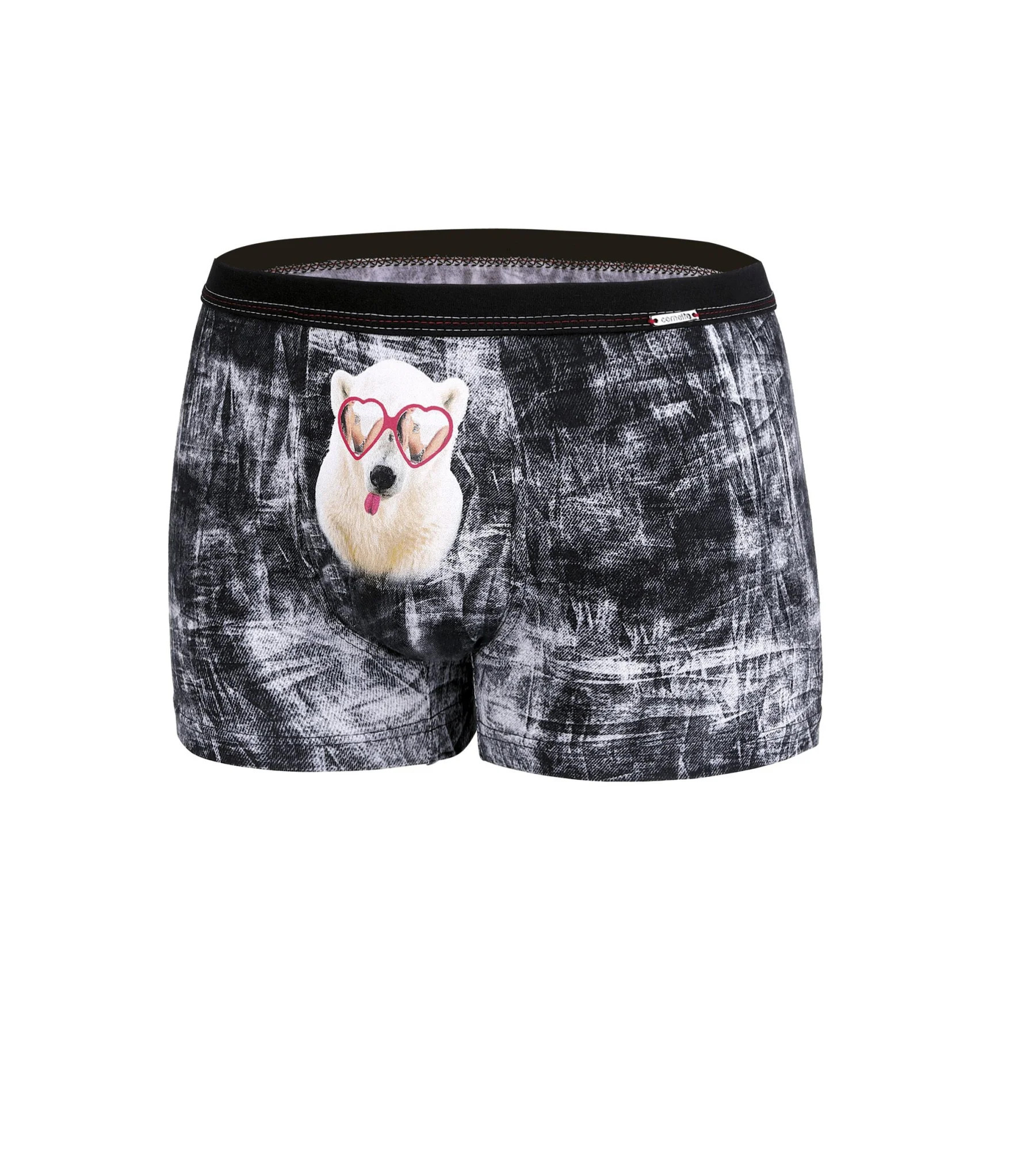 Pánské boxerky z valentýnské edice 2020. Černobílé s výrazným potiskem roztomilého medvídka na přední straně boxerek, který se na vás dívá skrz růžové brýle a ví, že jste mu padli do oka... Perfektní nápad na dárek pro někoho blízkého. Složení: 95% bavlna, 5% elastan.
