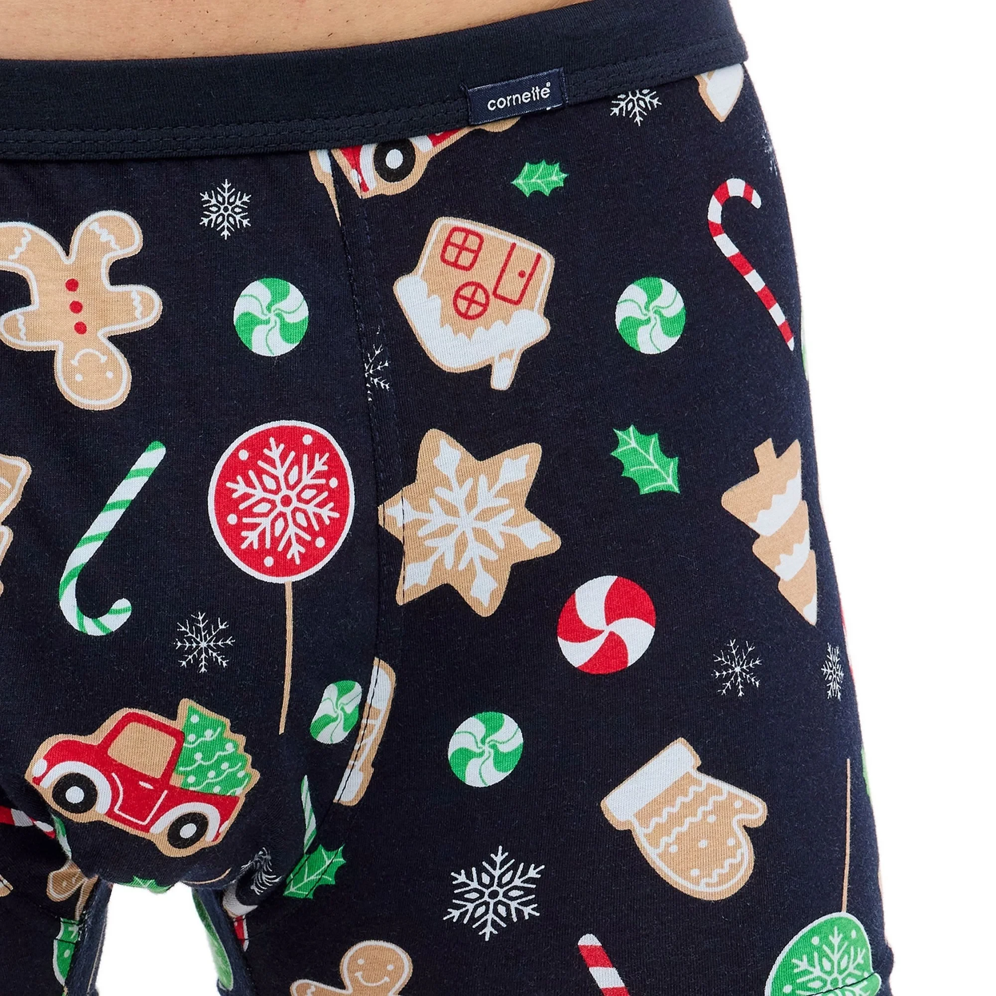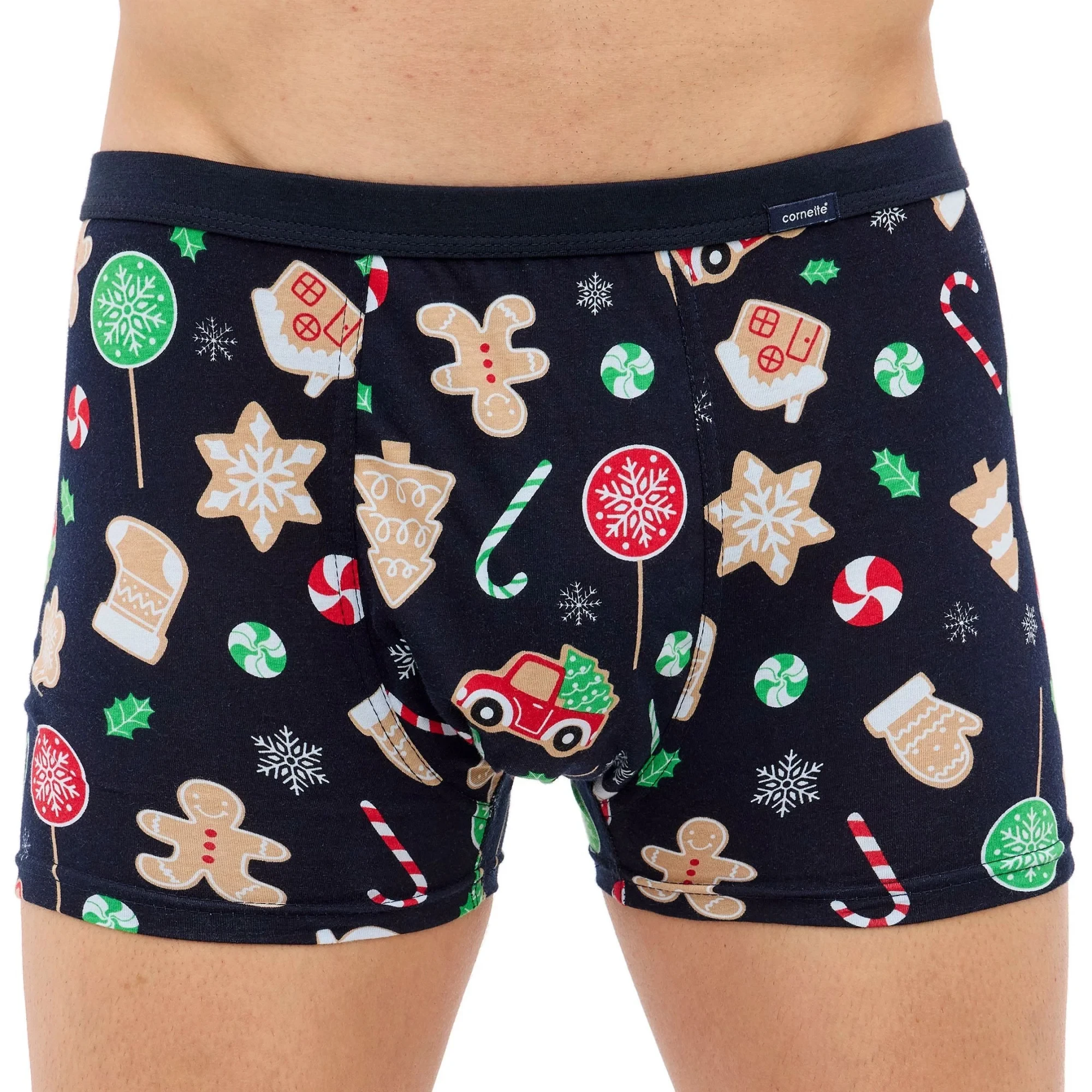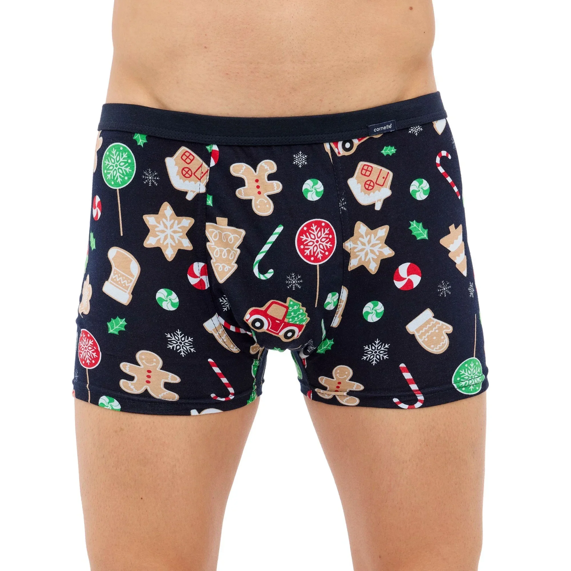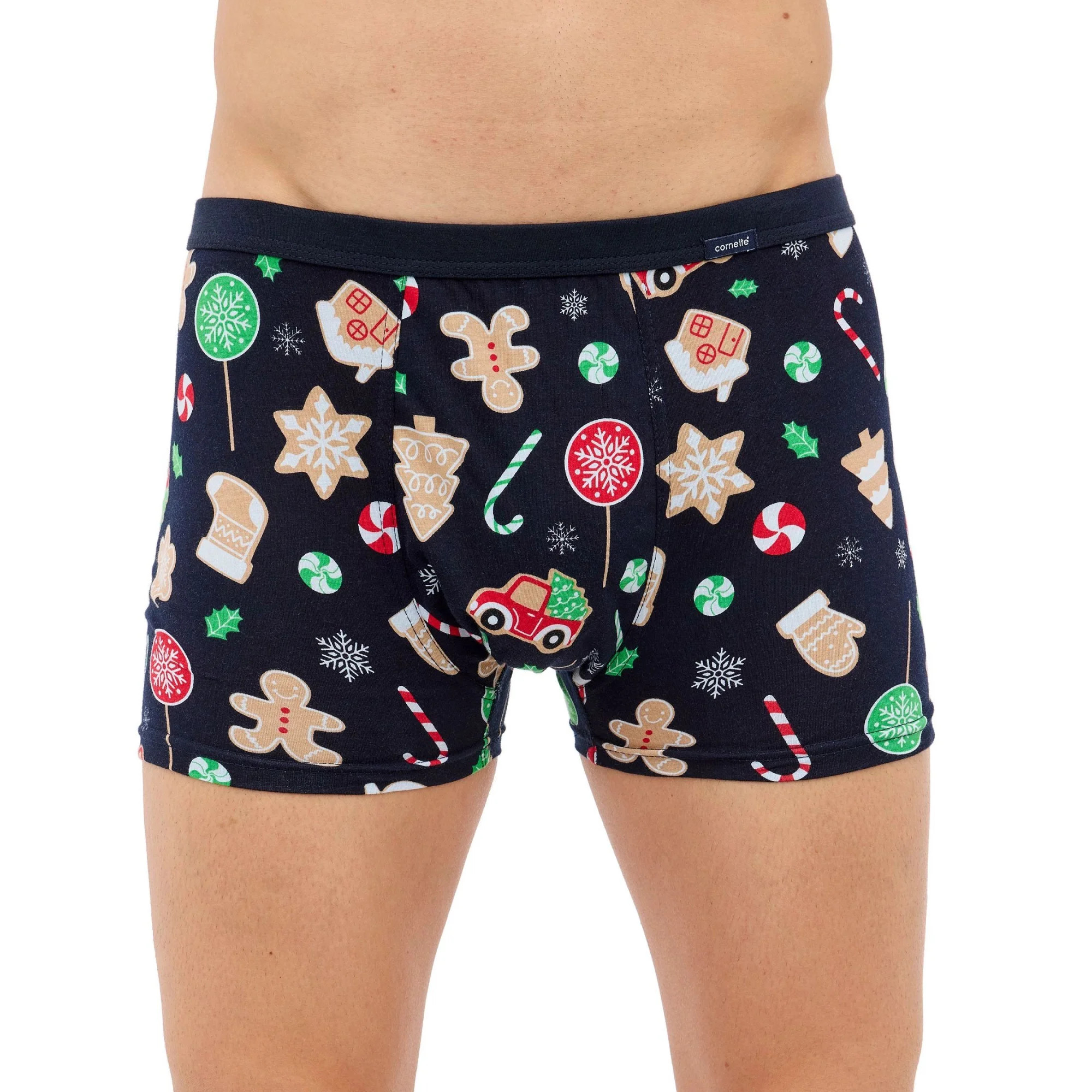Pánské boxerky 007/74 Candy CORNETTE - tmavě modrá barva - z vysoce jakostní bavlny - ozdobené barevným potiskem - boxerky mají gumu sešitou plochým švem - guma je obšitá bavlnou - lem nohaviček netlačí do stehen, proto jsou boxerky při nošení pohodlné a komfortní - vánoční kolekce