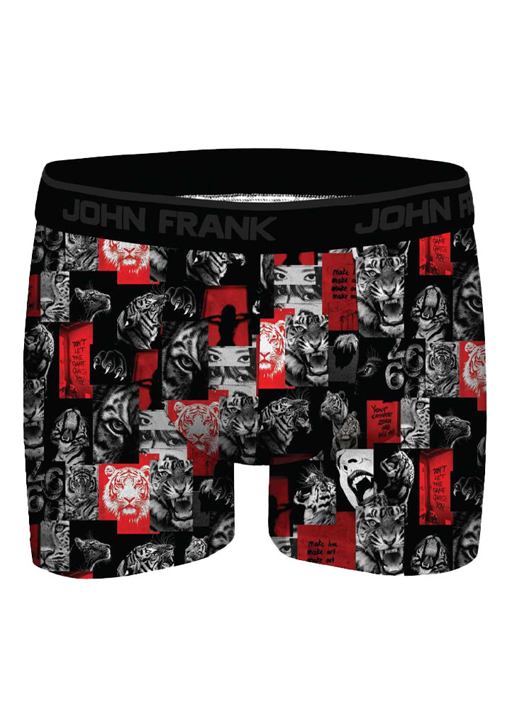 Pánské boxerky John Frank z prémiového micro modalu zaujmou výrazným designem v kombinaci černé, bílé a červené barvy. Micro modal je mimořádně jemný, lehký a hebký materiál, který je velmi příjemný na dotek, skvěle prodyšný a efektivně odvádí vlhkost, takže zajišťuje maximální komfort po celý den. Boxerky mají pružný pas s logem značky John Frank, který dobře drží, nezařezává se a perfektně se přizpůsobí postavě. Díky elastickému složení materiálu boxerky skvěle sedí, drží tvar a neomezují v pohybu, což z nich dělá ideální volbu pro každodenní nošení.