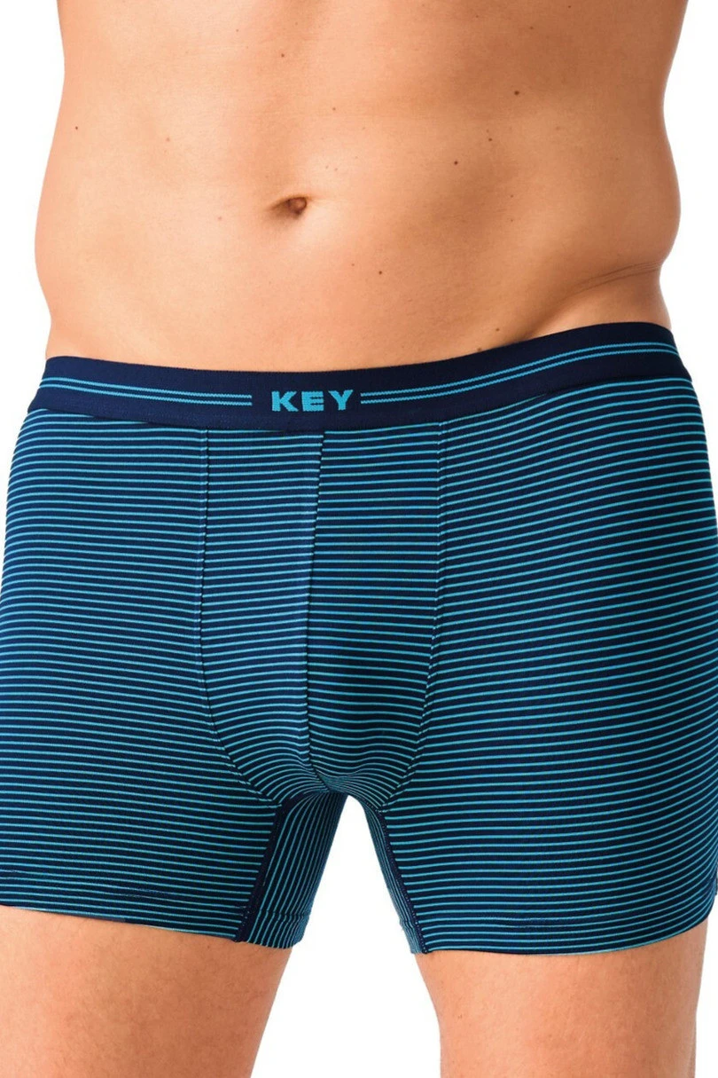 Střih s krátkými nohavicemi přiléhá těsně k tělu, neshrnuje se a zaručuje volnost pohybu. Široká guma s logem KEY drží prádlo bezpečně v pase, aniž by nadměrně tlačilo. Tmavě modrý základ s tyrkysovými pruhy dodává modelu moderní, dynamický charakter.