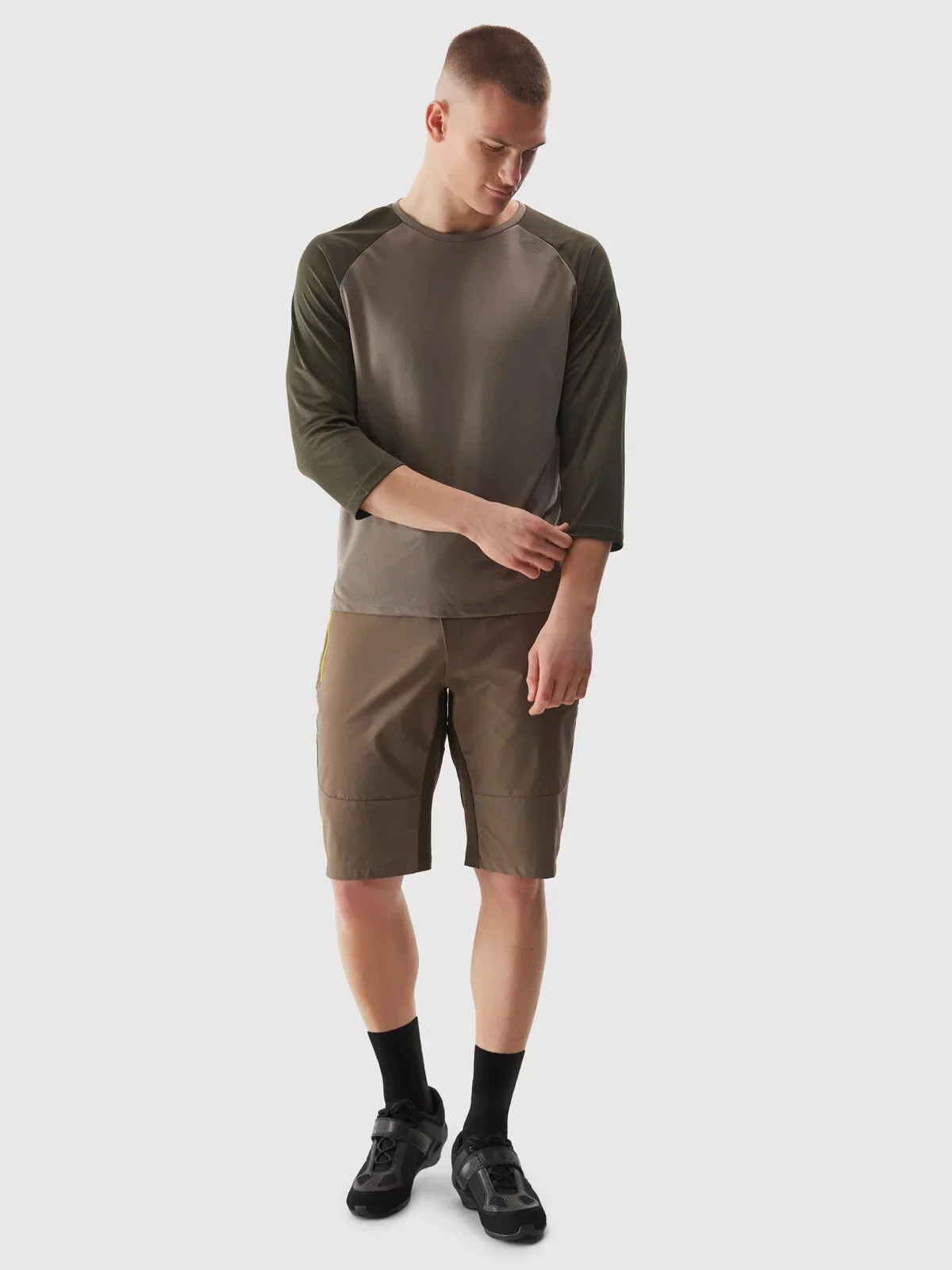 Pánská kolekce MOUNTAIN BIKE byla inspirována drsnou přírodou, z níž vycházela barevná paleta zemitých tónů přerušovaná intenzivní kobaltovou a žlutou barvou. Oděv byl navržen pro nadšence extrémní jízdy na horských a lesních stezkách.