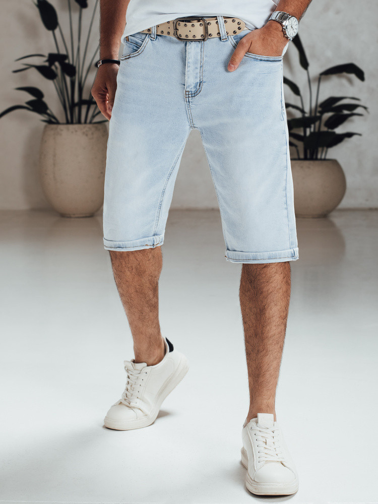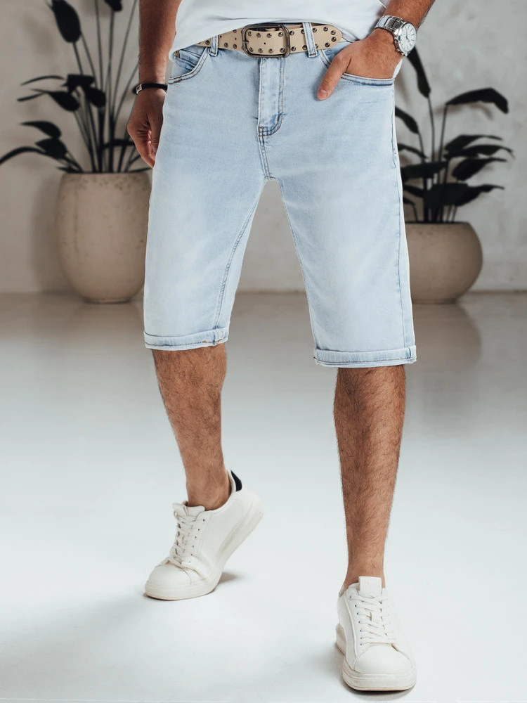 Męskie szorty jeansowe z jasnym efektem sprania, wyposażone w praktyczny pasek z dekoracyjnymi nitami. Klasyczne zapięcie i podwijane nogawki dopełniają luźny fason. Wygodna opcja na lato, idealna zarówno do sneakersów, jak i casualowych koszulek.