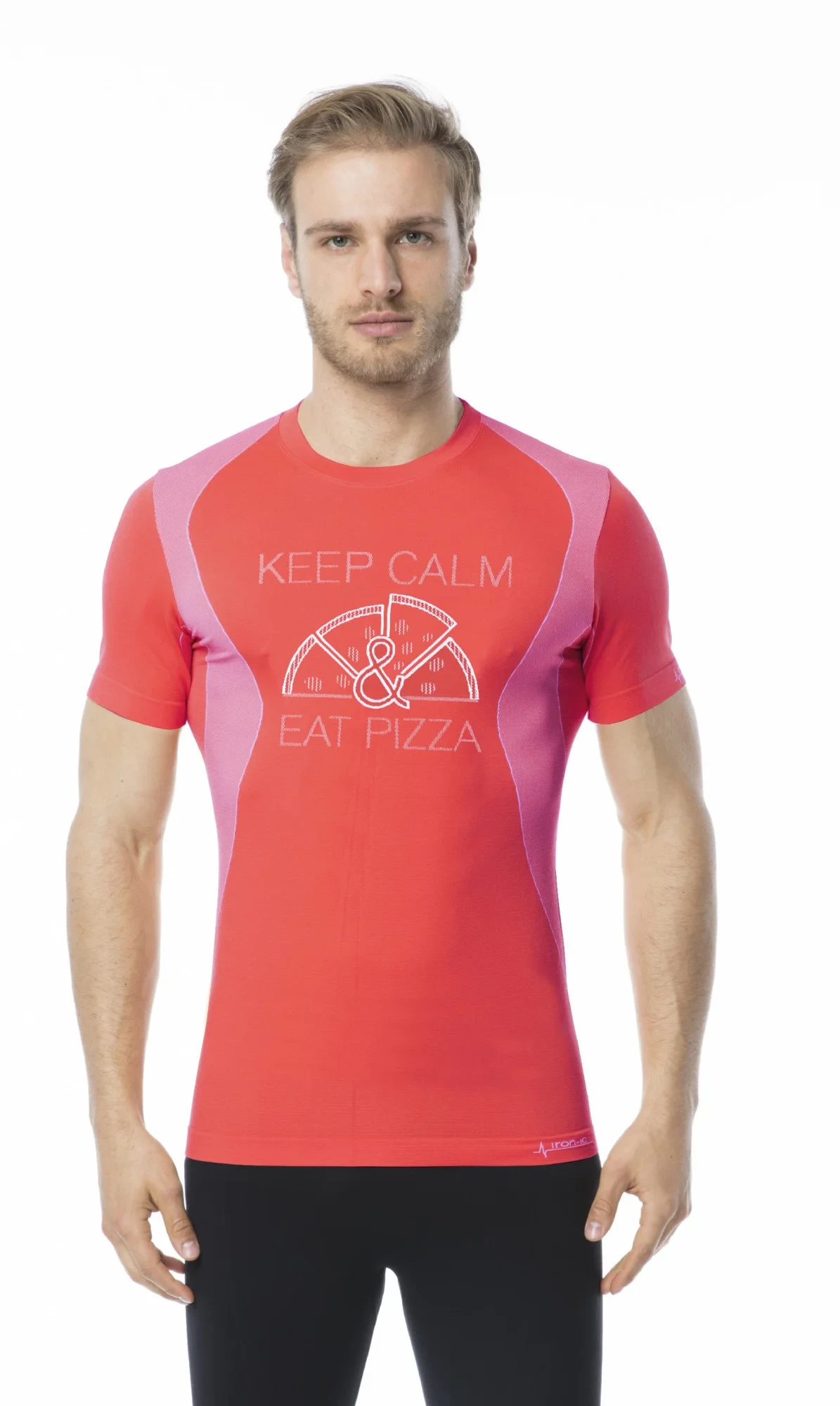 Pánské funkční triko s krátkým rukávem s motivem Keep Calm & Eat Pizza a anatomickým střihem. Díky ultralehké tkanině a diferencovaným vložkám udržuje pocit tepla a skvělé odvádí pot. Vhodné do teploty od +5°C do +35 °C.