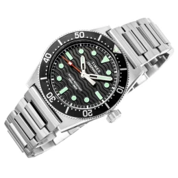 Czarna stalowa koperta przyciąga uwagę wyrazistą, zębatą lunetą i tarczą ozdobioną falistym wzorem, który dodaje głębi i nawiązuje do wodnego żywiołu. Jednokierunkowy obrotowy bezel umożliwia precyzyjne i bezpieczne odmierzanie czasu pod wodą – niezbędna funkcja dla każdego nurka. Prosta, ale przemyślana kompozycja tarczy zapewnia maksymalną czytelność nawet w warunkach ograniczonej widoczności. Całość dopełnia czerwony sekundnik z luminescencją, który podkreśla dynamiczny i sportowy charakter tego modelu.