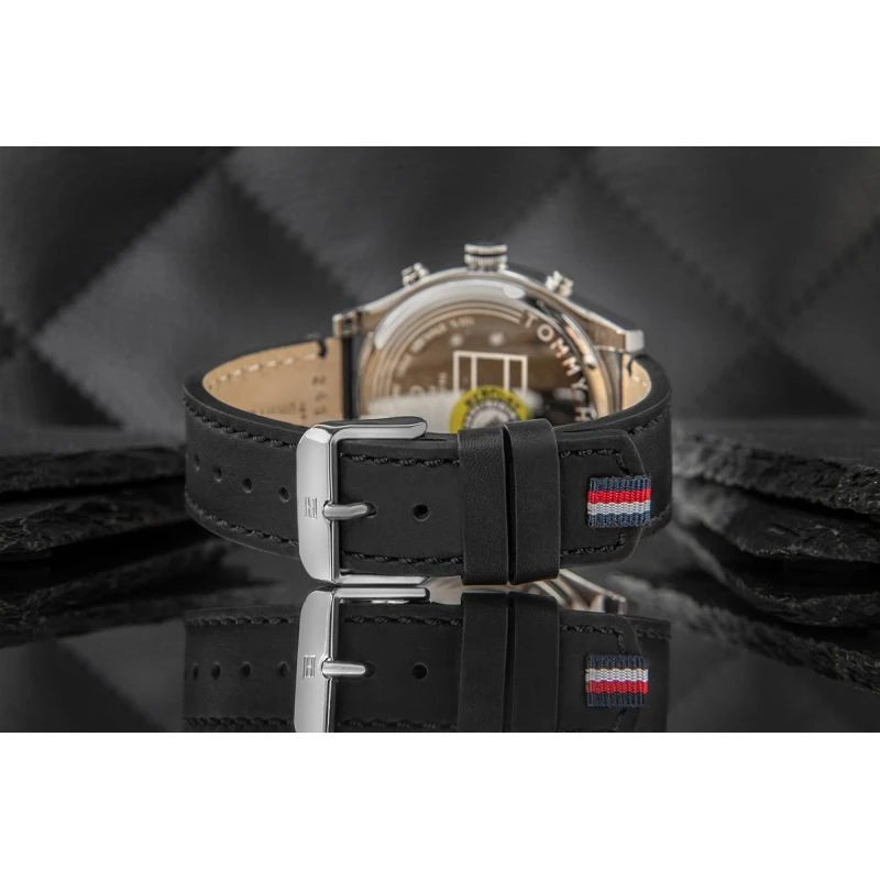 Srebrna koperta otacza głęboką, czarną tarczę, gdzie kontrastujące biało-czarne indeksy nadają zegarkowi wyrazistości i nowoczesnego charakteru. Srebrne wskazówki oraz sekundnik z odważnym, czerwonym akcentem wprowadzają dynamiczny pazur, a czarny skórzany pasek idealnie dopełnia całości, tworząc dodatek, który pasuje zarówno do garnituru, jak i casualowego looku. Subtelne czerwone akcenty na subtarczu chronografu nadają zegarkowi Tommy Hilfiger Ashton dynamicznego, sportowego charakteru. Te detale przyciągają uwagę, podkreślając wyjątkowy design i precyzję wykonania.