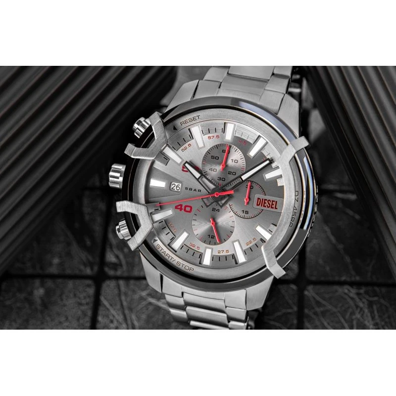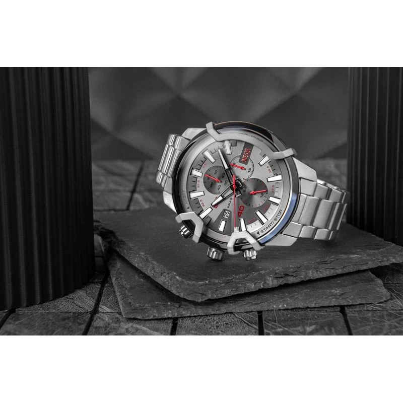 Srebrzystoszary odcień z delikatnym, szczotkowanym wykończeniem tworzy bazę, która wydobywa moc detali. Wyraziste, czerwone akcenty na wskazówkach i subtarczach wnoszą dynamikę i energię, jakby zegarek był gotowy na każdą akcję. Wysokie indeksy i elementy wystające z powierzchni tarczy nadają jej trójwymiarowego charakteru, podkreślając solidność i głębię projektu. Dzięki powłoce luminescencyjnej na wskazówkach i indeksach odczyt czasu jest możliwy nawet w słabym świetle, co zwiększa praktyczność modelu. Maszynowy napis DIESEL wygrawerowany z boku koperty to detal, który mówi wiele o charakterze tego modelu – surowy, bezkompromisowy, gotowy sprostać oczekiwaniom najbardziej wymagających mężczyzn.