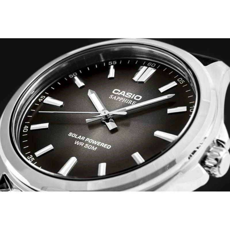 Wykorzystaj moc słońca z analogowym zegarkiem CASIO Solar. Dzięki zasilaniu solarnemu nie musisz martwić się o baterie – panel słoneczny ładuje zegarek światłem, zapewniając mu nawet 4 miesiące pracy po pełnym naładowaniu. Tarcza w odcieniu głębokiej czerni przypomina rozchodzące się światło słoneczne, nadając całości charakteru i głębi. Szkło szafirowe z powłoką antyrefleksyjną nie tylko chroni przed zarysowaniami, ale też wydobywa głębię koloru tarczy, zachowując jej czytelność nawet w ostrym świetle. Wodoszczelność na poziomie 50 metrów zapewnia ochronę podczas codziennego użytkowania – bez obaw o kontakt z wodą, deszczem czy myciem rąk. To dopracowany w każdym detalu model, który łączy nowoczesną technologię z klasyczną, męską elegancją.