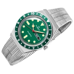 Zielona tarcza zegarka została wykończona w stylu „sunburst”, który pięknie odbija światło, nadając głębi kolorowi. Wyposażona jest w wyraźne, luminescencyjne indeksy i wskazówki, zapewniające doskonałą czytelność nawet w ciemności. Zamiast cyfr zastosowano geometryczne markery – koła i prostokąty – które przywołują stylistykę nurkowych modeli sprzed dekad.