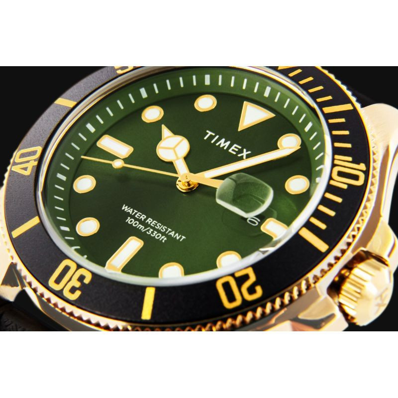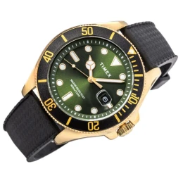 Męski Model TIMEX Harborside Coast prezentuje się znacznie powyżej swojej klasy cenowej, oferując wygląd i jakość godną luksusowych diverów. Masywnastalowa koperta o średnicy 44 mm, polerowane wykończenie i obrotowy bezel z czytelnymi oznaczeniami sprawiają, że zegarek natychmiast przywodzi na myśl sportowe modele premium. Centralnym punktem jest datownik z wypukłym szkłem powiększającym – detal, który dodaje zegarkowi klasy i nawiązuje do najlepszych wzorców w świecie czasomierzy. Zielona tarcza typu sunray i perforowany kauczukowy pasek zapewniają nie tylko świetny wygląd, ale i wygodę – także w wodzie, dzięki wodoszczelności do 100 m. Luminacja wskazówek i indeksów oraz osłona koronki to detale, które czynią ten zegarek funkcjonalnym i gotowym na każdą przygodę. Całość stanowi idealny wybór dla mężczyzny, który chce wyróżniać się nowoczesnym, prestiżowym dodatkiem.