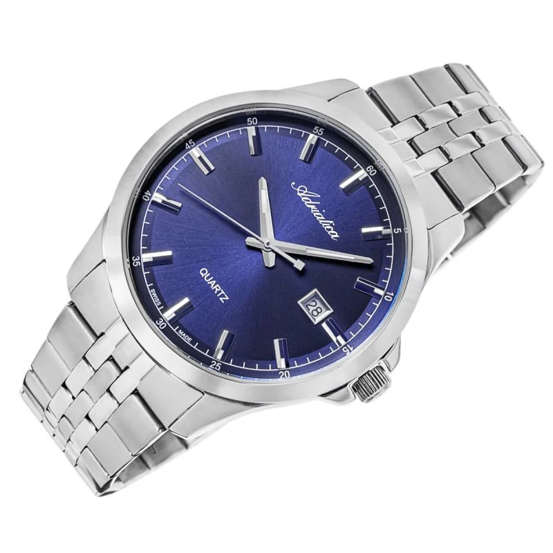 Męski zegarek Adriatica Premiere A8304.5115Q to wyraz szacunku do klasyki, precyzji i szwajcarskiego kunsztu, który od dekad wyznacza standardy w świecie zegarmistrzostwa. W jego sercu bije niezawodny, kwarcowy mechanizm Swiss Made – precyzyjny, solidny, stworzony po to, by działać bez zarzutu przez długie lata, bez względu na to, jak atywny jesteś podczas dnia. Trzy wskazówki – godzinowa, minutowa i sekundowa – płynnie przesuwają się po eleganckiej tarczy w głębokim odcieniu granatu, gdzie subtelne indeksy i precyzyjny nadruk tworzą harmonijną całość, udowadniając, że prawdziwa klasa tkwi w prostocie. Delikatne elementy luminacji dbają o czytelność wskazań nawet po zmroku, a odporne na zarysowania utwardzane szkiełko mineralne skutecznie chroni to, co najważniejsze. 43-milimetrowa koperta ze stali nierdzewnej została zaprojektowana tak, by dobrze leżała na nadgarstku, nie dominując go, ale będąc wyrazistym elementem całości. Uzupełnieniem jest segmentowana bransoleta, która prezentuje się solidnie i jednocześnie lekko, wpisując się w styl współczesnego mężczyzny.