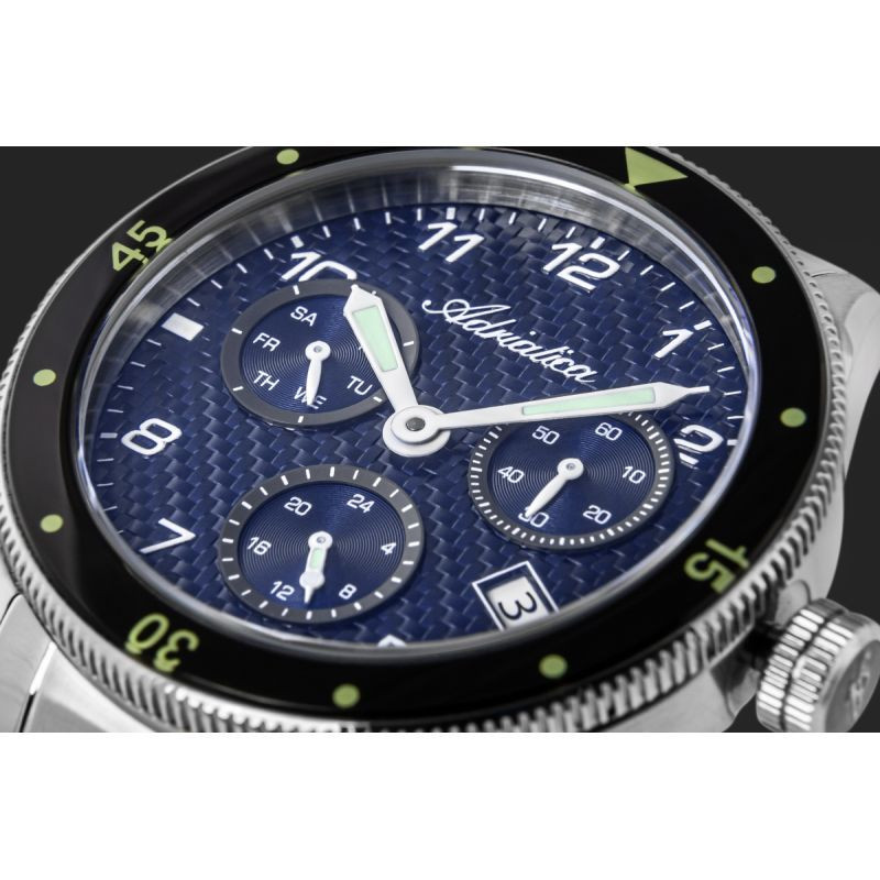 Męskui zegarek Adriatica A8322.5155QF został stworzony z myślą o mężczyznach, którzy cenią siłę detalu i techniczną precyzję. Niebieska tarcza o strukturze włókna węglowego nadaje mu sportowy, nowoczesny charakter, a masywna stalowa koperta i bransoleta gwarantują trwałość na lata. Trzy funkcjonalne chronografy wskazują dzień tygodnia, czas 24-godzinny oraz licznik sekund – wszystko czytelnie, konkretnie i na miejscu. Obracany bezel z naniesioną skalą minutową to nie tylko detal wizualny, ale i praktyczne narzędzie do odmierzania czasu. Zegarek napędzany jest szwajcarskim mechanizmem kwarcowym Ronda X30 Swiss Made, który nie zawodzi. Całość chroniona jest przez wysokiej klasy szkło mineralne z antyreflexem,odporne na zarysowania – rozwiązanie, które doceni każdy, kto ceni trwałość i estetykę.