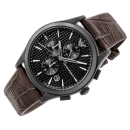 Zegarek męski Emporio Armani Paolo AR11549 to elegancki i wszechstronny chronograf, który łączy klasykę z nowoczesnym charakterem. Koperta ze stali nierdzewnej o ok. 42 mm średnicy harmonijnie współgra z skórzanym paskiem, tworząc wyrazisty, ale uniwersalny wygląd. Na tarczy w odcieniu głębokiej czerni, kontrastujące wskazówki i indeksy, a także okienko datownika – wszystko podkreśla precyzyjny charakter tego modelu. Serce zegarka stanowi mechanizm kwarcowy, gwarantujący niezawodną pracę bez konieczności codziennej regulacji, a funkcja chronografu pozwala odmierzanie krótkich odcinków czasu z dużą dokładnością. Model wspiera odporność na wodę na poziomie 5 barów, co zapewnia ochronę przed przypadkowymi zachlapaniami w codziennym użytkowaniu, czyniąc go doskonałym wyborem zarówno na co dzień, jak i na bardziej formalne okazje.