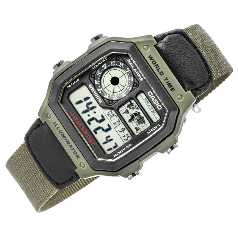 Casio AE-1200WHB-3BVDF to męski zegarek cyfrowy z kultowej serii Casio Collection, który w wyjątkowy sposób łączy wojskowy styl i retrodesign z nowoczesną technologią. Solidna koperta z tworzywa sztucznego, szkiełko haselitowe oraz wytrzymały pasek parciany o tekstylnej fakturze tworzą lekką, a zarazem niezwykle wygodną konstrukcję, idealną na co dzień i w podróży. Ciemnozielona kolorystyka z czarnymi akcentami i prostokątna tarcza LCD z mapą świata nadają zegarkowi charakterystyczny, przygodowy wygląd inspirowany stylem vintage. Model wyposażono w funkcję czasu światowego (World Time), pięć alarmów dziennych, stoper 1/100 sekundy, timer odliczania, automatyczny kalendarz oraz podświetlenie LED z regulacją czasu świecenia. Zasilany baterią o żywotności do 10 lat, oferuje również wodoszczelność 100 metrów, dzięki czemu doskonale sprawdzi się zarówno w miejskiej dżungli, jak i w terenie. Casio AE-1200WHB-3BVDF to zegarek dla mężczyzn, którzy cenią niezawodność,