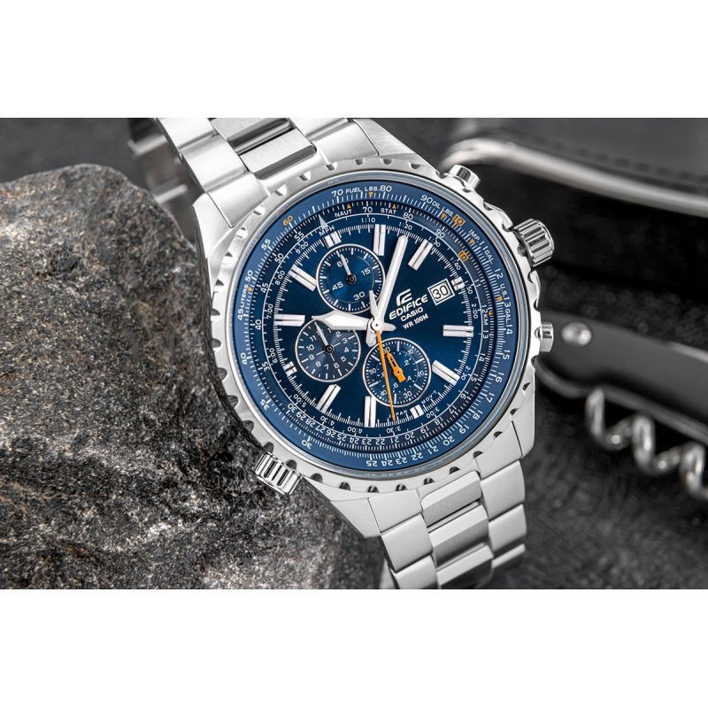 Model pro muže, kteří si cení přesnosti, funkčnosti a technického designu. Co najdete uvnitř? Uvnitř hodinek se skrývají stopky s přesností na 1/20 sekundy a logaritmická stupnice s otočným posuvníkem pro přesné měření a výpočty času, rychlosti, spotřeby paliva a mnoho dalšího. Robustní náramek z nerezové oceli díky menším zaobleným segmentům ještě lépe sedí na zápěstí, zatímco rýhovaný rámeček, přesné hodinové značky na ciferníku a minerální sklíčko dodávají hodinkám špičkový design.